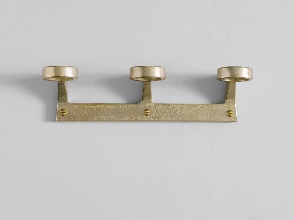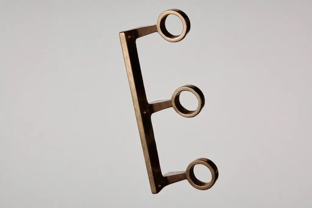 Brass Trio Bottle Bracket by Henry WilsonDimensions: W 23.5 x D 7.1 x H 5.7 cmMaterials: Brass.Available in Solo, Duo, or Trio versions.Available in three configurations, the Bottle Bracket is designed to accommodate one, two, or three pump-operated dispensers of hair and/or body care products, whether in domestic or hospitality settings.Because each piece is sand-cast and manufactured in small batches, slight variations will be visible from one bracket to another. These production marks may include slight pour ripples or surface pitting. Please note that metal reacts to formulations containing soap and that this is unavoidable; however, a quality metal polish will restore the original finish. The same applies if you prefer a brighter finish to the distinctive patina affected gradually by the process of oxidization.Henry Wilson's work combines a rational, democratic utility with an element of sculptural expression. There is a clear form and function in our products, but it’s important they also have feeling. We are interested in the awkward beauty that comes from something made by hand. We like to explore how imperfection can be introduced into an Industrial process, to make something at scale that retains a sense of individual charm.Permanent collections and exhibitions- Museum of Applied Arts and Sciences, Sydney, Australia- Art Gallery of Western Australia, Perth, Australia- 'Sempering' XXI Triennale, MUDEC, 2016, Milan, Italy.