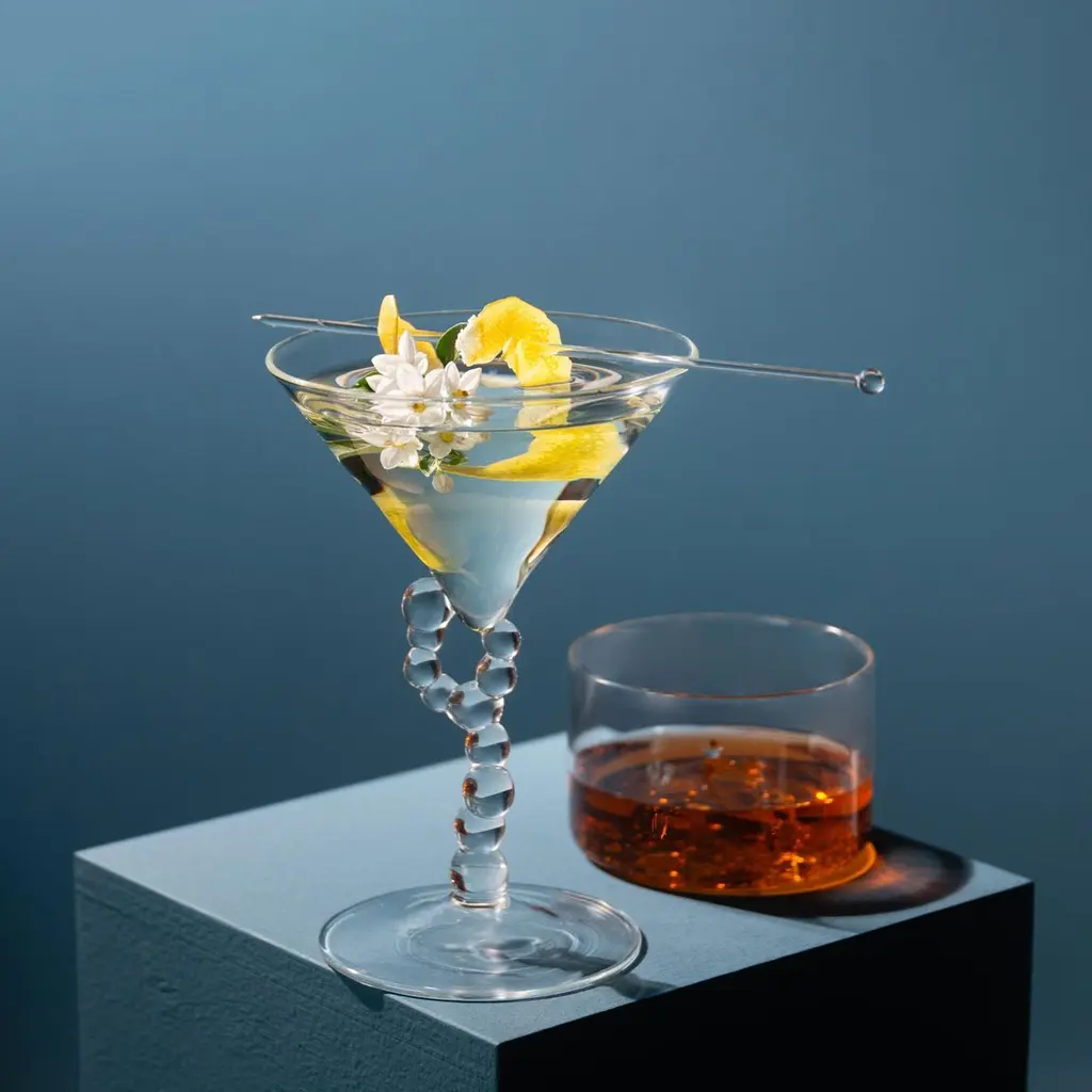 Introducing the Alchemica Martini Glass, a breathtaking hand-blown creation by the talented Simone Crestani. This stunning glass is a standout piece from the imaginative Alchemica Collection, where traditional barware is reimagined with a delightful twist.Crafted with meticulous attention to detail, the Alchemica Martini Glass draws inspiration from the intriguing world of chemical laboratory glassware. Its sleek, elegant design reflects the silhouette of vials and test tubes, transforming scientific elements into a sophisticated domestic object. Each sip is enhanced by the enchanting sight of bubbles that rise and twirl within the glass, inviting you to indulge in the artistry of mixology.Ideal for serving classic martinis or any cocktail of your choice, this glass elevates your drinking experience, adding a touch of glamour to any occasion. The Alchemica Martini Glass is more than just a functional piece; it's a statement of style, making it a perfect gift for cocktail lovers and anyone who appreciates the beauty of handcrafted artistry.Dimensions: diam.11,5 h.17 cmMaterials: Borosilicate GlassPlease note: Each glass is lovingly handcrafted, resulting in slight variations that enhance its unique character.