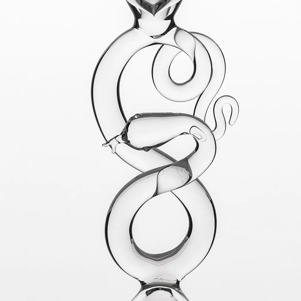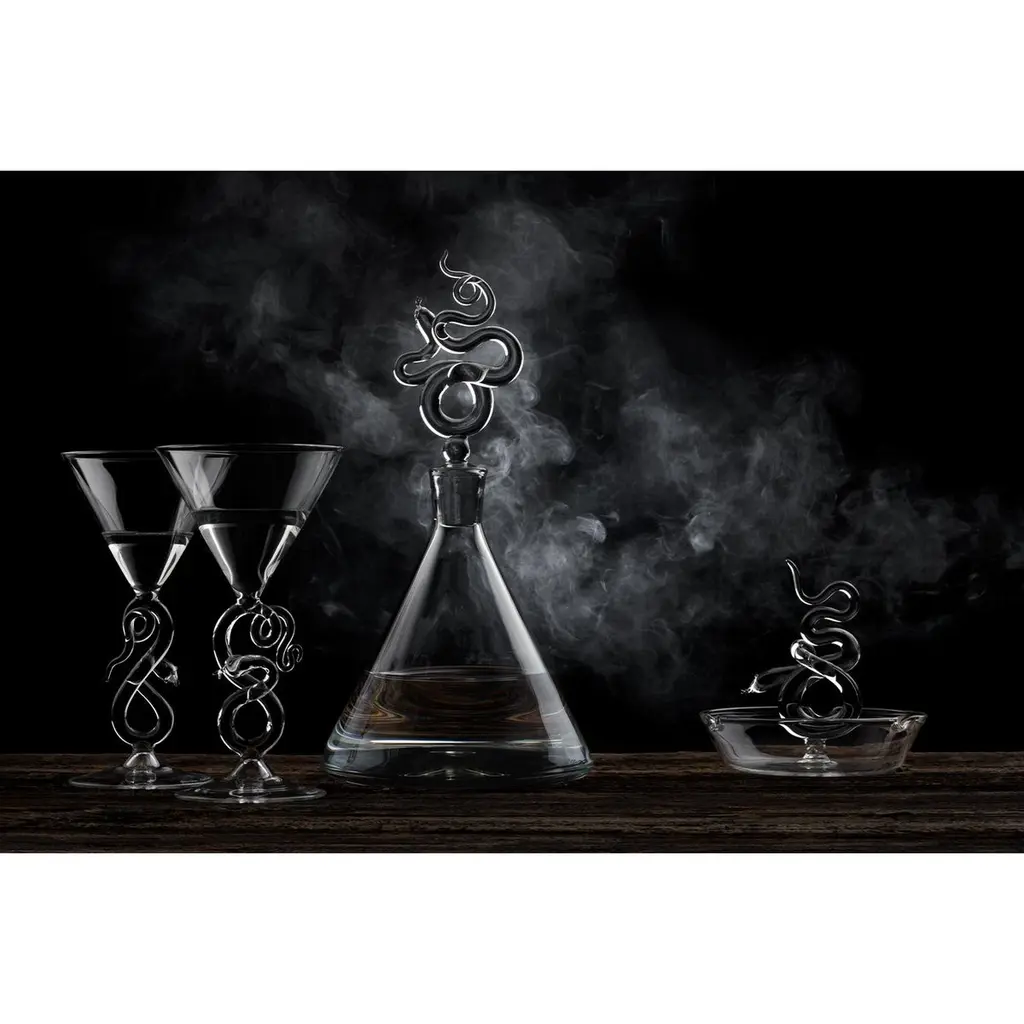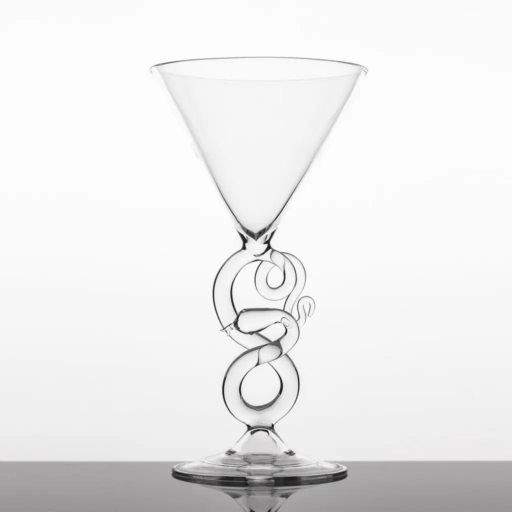 A stunning hand-blown creation by Simone Crestani, the Serpentine Martini Glass is a remarkable piece from the Serpentine Collection, blending artistry with symbolic allure.The Serpentine Collection, featuring liquor bottles, martini glasses, and ashtrays, draws its inspiration from the intricate snake iconography of 18th-century prints. Representing the dual nature of vice—irresistible temptation and its hidden danger—this martini glass embodies elegance with a touch of mystique. Its sinuous curves and sculptural design make it an exquisite centerpiece for your cocktail rituals.Perfect for hosting or as a gift, the Serpentine Martini Glass transforms the enjoyment of your favorite drink into a captivating experience, merging functionality with the timeless artistry of glassmaking.Dimensions: Diam. 11 cm (4.3 in), Height 20 cm (7.9 in)Material: Borosilicate GlassPlease note: Each glass is lovingly handcrafted, resulting in slight variations that enhance its unique character.