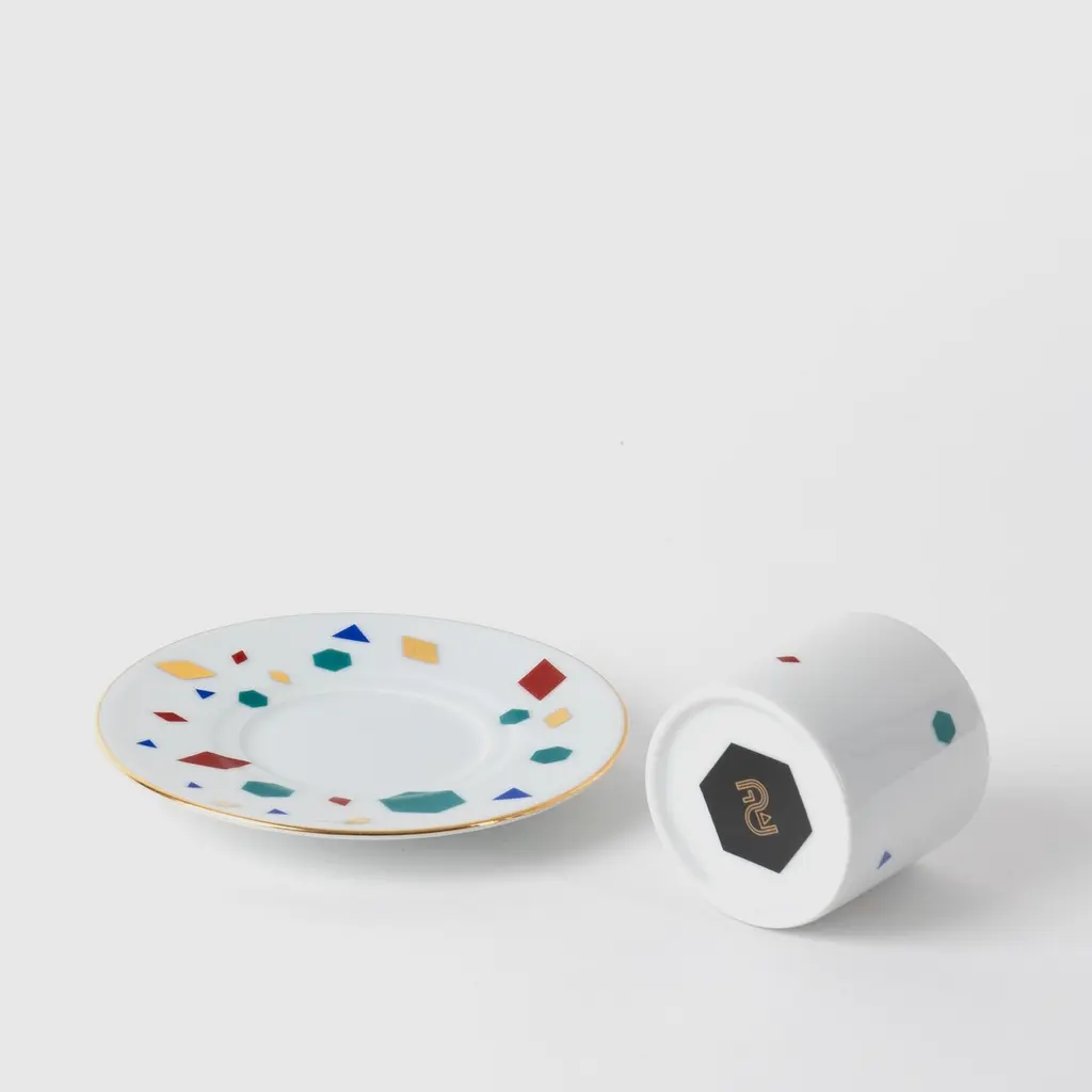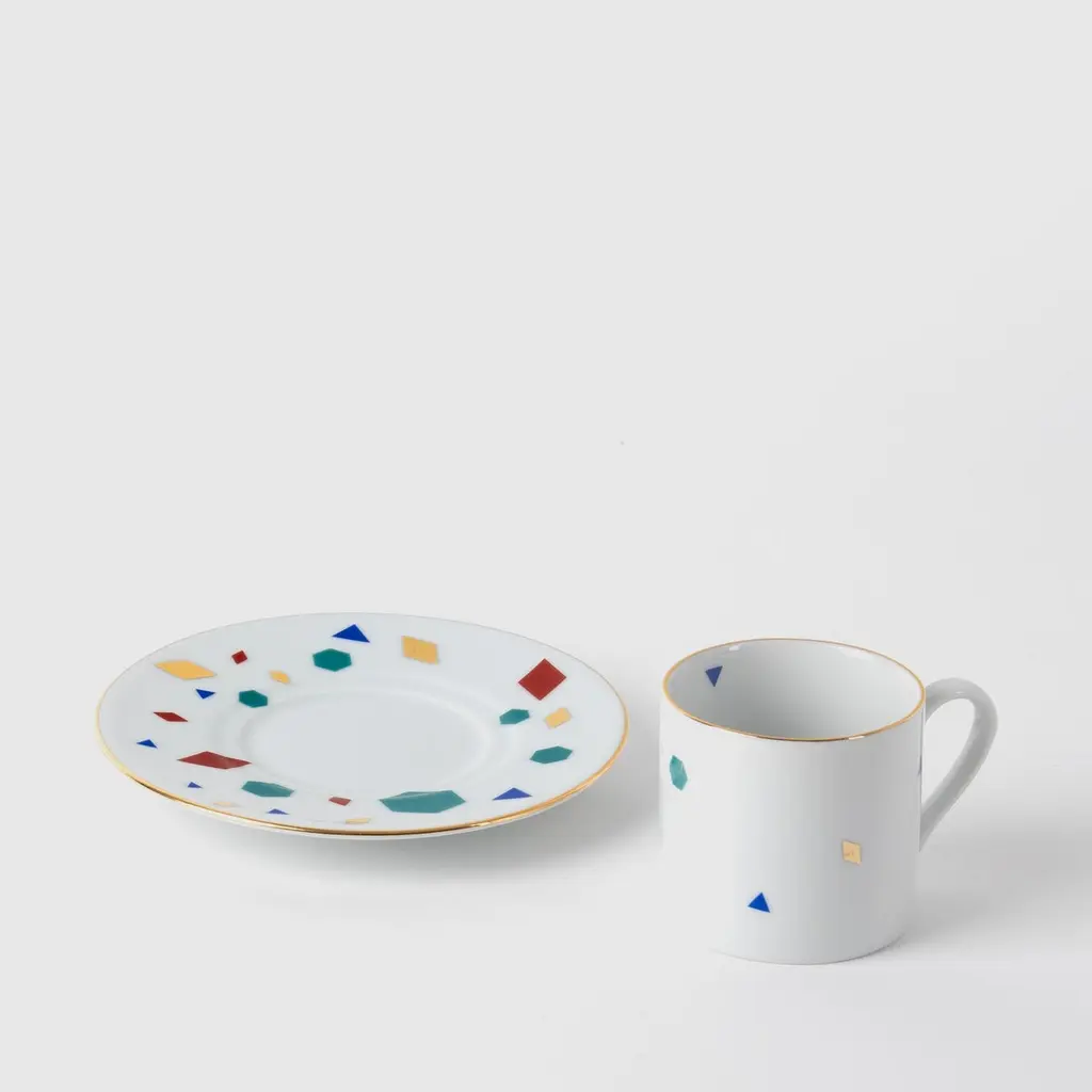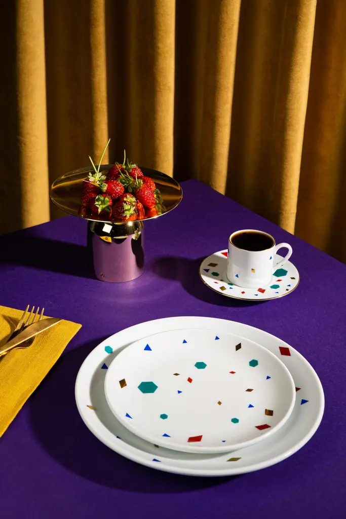 Çini porcelain plates derived from an extensive research and deconstruction of traditional Ottoman tile work. While the patterns are repeated regularly in the art of tile making, the four different forms based on this collection are placed freely on the two surfaces of the plates. While each product has an equal number of patterns, the pattern becomes dispersed as the plate size grows.Çini collection consists of dinner plates, coffee cups and saucers in different sizes.Since our products are handmade, there may be slight differences in color and form. These are traces of handmade, not considered a fault.