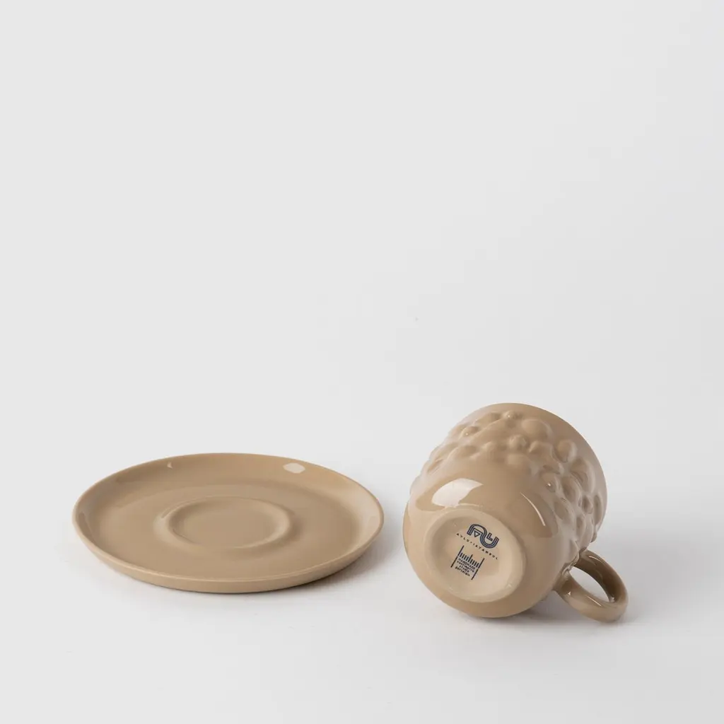 Justine porcelain pieces are inspired by the ancient Byzantine jewelry. Delicate porcelain transforms cups into timeless design objects by translating pearl and stone details of jewelry into flowing forms.With their pastel colors and delicate structures, the Justine series is ideal for making daily rituals special. Justine coffee, tea glasses and bowls are produced in Ayvalik with the original technique of Santimetre Porcelain for Avlu.Dimensions: R 6 x 5,5 cm R 10,5 x 1 cm - 100 mlMaterial: hand glazed limoges porcelain slip Packaging: A set including one cup and one saucer in a signature Avlu gift box with user manualThe product is suitable for use in the dishwasher. However, we recommend using liquid dishwashing liquid to make gold decors last longer. For stains such as tea and coffee, we recommend using a non-abrasive, suitable detergent and soft cloth/sponge.