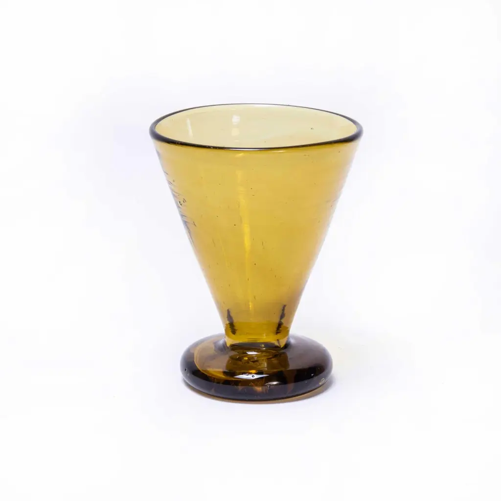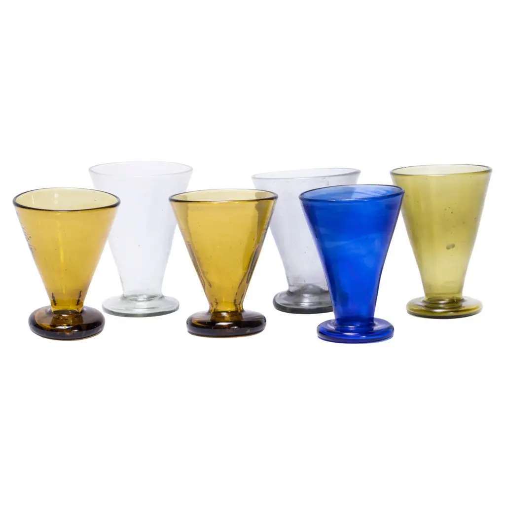 Contemporary Moroccan conical glasses – set of sixContemporary Moroccan conical glasses – set of six. Hand-made in Morocco. The glass is mouth blown and available in a set of assorted colours as shown. The glass is mouth blown in a wonderful artisan quality. Because of the artisan production the colours can vary, the colours will reflect the images shown. The image shows five glasses, the set is for six pieces.WORKSHOP REPORTOur workshop team inspect every product and carry out any needed repairs to ensure that everything leaves us serviced and maintained ready for many more years of life. All of our vintage products show the rich beauty and history of their life with the knocks and bumps of many years of use and we try to minimise restoration to keep every piece as original as possible.