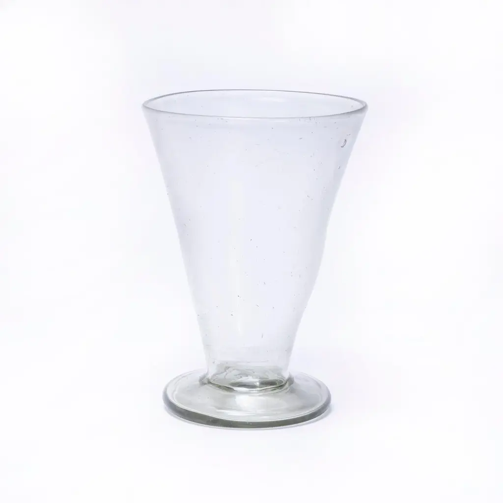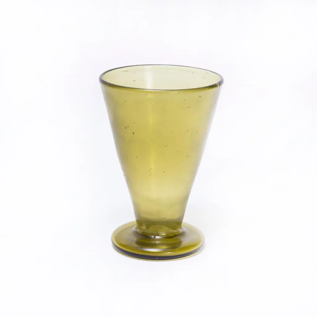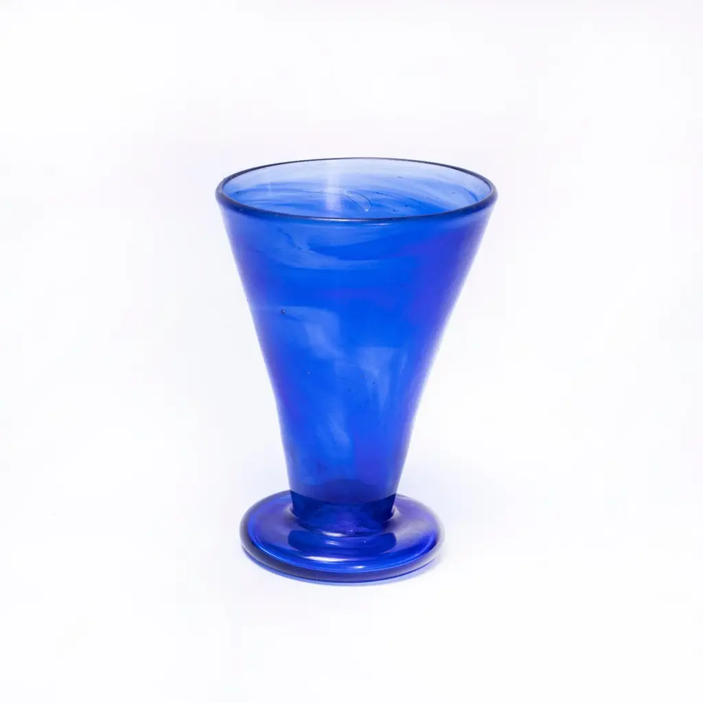 Contemporary Moroccan Conical Glasses - Set Of Six. Hand-made in Morocco. The glass is mouth blown and available in a set of assorted colours as shown. The glass is mouth blown in a wonderful artisan quality. Because of the artisan production the colours can vary, the colours will reflect the images shown. The first three images show the different types of sets of glasses we have and the set will be picked at random if not specified in order notes.Workshop Report:Our workshop team inspect every product and carry out any needed repairs to ensure that everything leaves us serviced and maintained ready for many more years of life. All of our vintage products show the rich beauty and history of their life with the knocks and bumps of many years of use and we try to minimise restoration to keep every piece as original as possible.Date:20th CenturyMaker:Handmade - MoroccoDimensions:8cm(w) x 8cm(l) x 11cm(h)