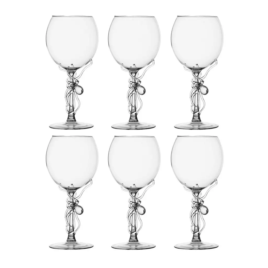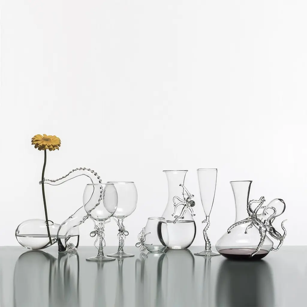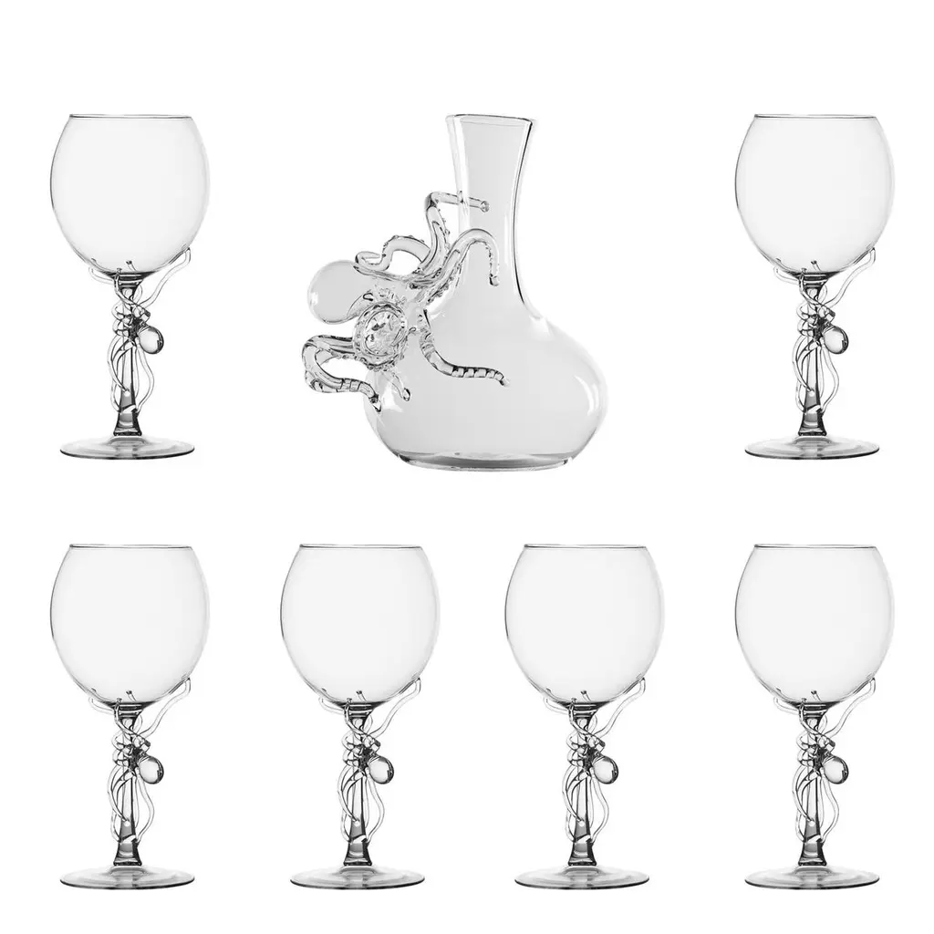 "Contemporary Polpo Hand-Blown Wine Glass" by Simone CrestaniIntroducing the Polpo Wine Glass, a masterpiece of artistry and craftsmanship by the renowned glass artist Simone Crestani. As a part of the exquisite Polpo Collection, this hand-blown wine glass embodies a captivating fusion of elegance and whimsy.Each curve and contour of the Polpo Wine Glass evokes a sense of enchantment, as if a graceful sea creature is delicately embracing the decanter or gracefully scaling the stem. The meticulous attention to detail pays homage to the enigmatic denizens of the deep, capturing their elusive beauty with unparalleled precision.Crafted from the finest borosilicate glass, this wine glass stands as a testament to both the artist's skill and the inherent allure of the ocean's inhabitants.A perfect balance of form and function, elevating any dining experience with its exquisite presence.Please note that due to the artisanal nature of handcrafting, each Polpo Wine Glass is subtly unique, promising you a one-of-a-kind treasure that may vary slightly from the images provided.Indulge in the allure of the sea and elevate your wine-tasting rituals with the Polpo Wine Glass, a symbol of sophistication and charm that transcends the ordinary.Dimensions: diam.4.52" h.9.05" InchMaterials: Borosilicate Glass