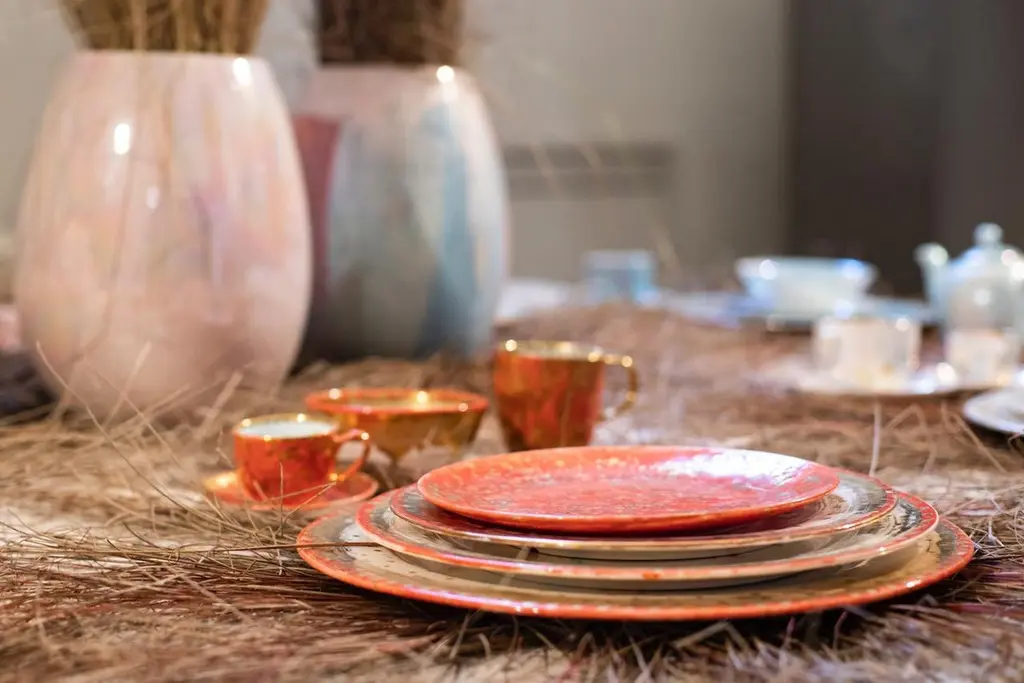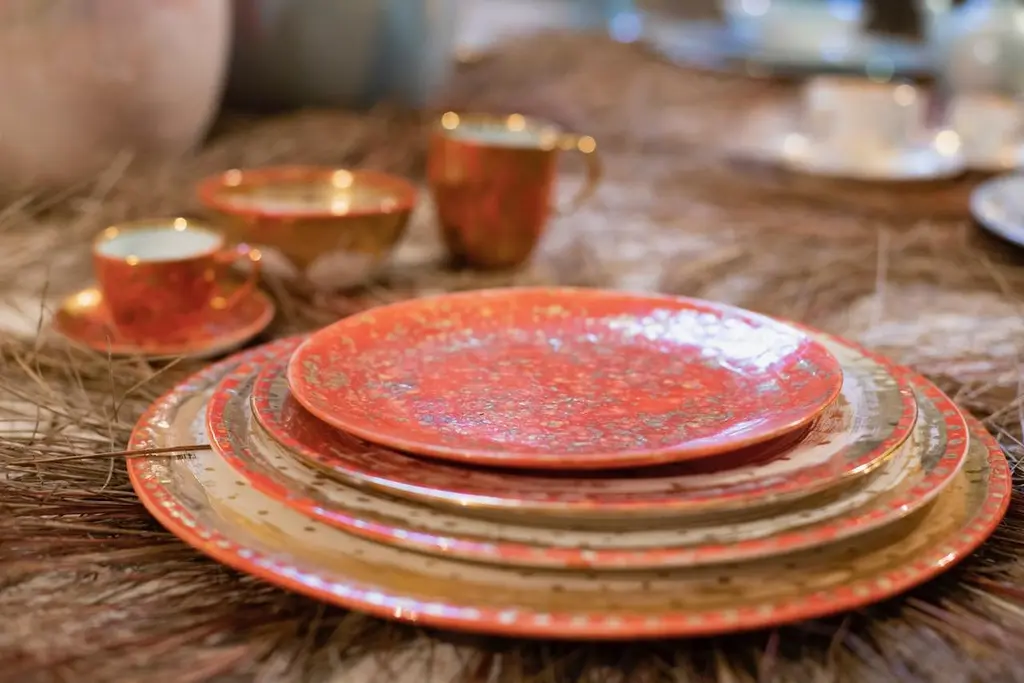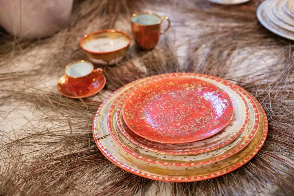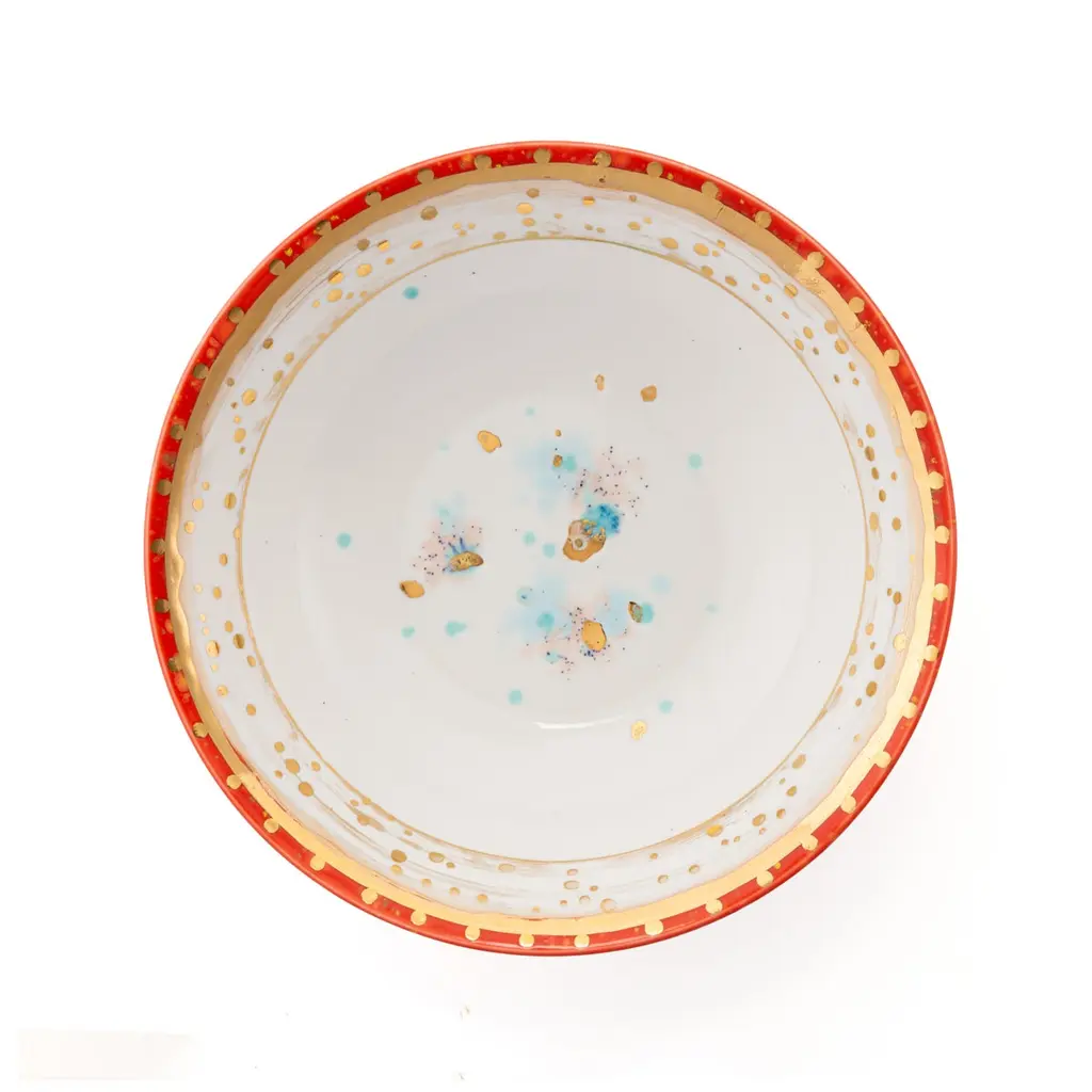 Hand painted in Italy from the finest porcelain, this salad bowl, from the Scipione collection, is sprinkled on the inside rim with a light decor of golden dots and thin circles; all around the edge, a narrow, African red decor, punctuated with golden dots; at the center, very delicate splotches of pink and light blue with sprinkles of golden dots. The outside is painted with a very light pink enamel dotted in black and blue.Salad bowl, measures: 28 x 8 H cmVilla Borghese, Scipione collectionHand painted porcelainHand painted 24-karat goldMade in ItalyFirst introduced at Milan Design Week 2018, the Scipione line is named after a hall of the Borghese Gallery in Rome and evokes ancient Roman military might.Each Coralla Maiuri product is entirely hand decorated. Each is a work of art. While ensuring consistency, they are never identical. Slight variations of decor and color from one to another are not only normal, but to be expected as a sign of their uniqueness.For large quantities, production lead time to be confirmedEven if all our tableware products are suitable for dishwasher machines, for long term conservation we warmly recommend to favour non-aggressive soap and delicate washing.Due to the presence of real 24-karat gold, this item is not suitable for microwave.