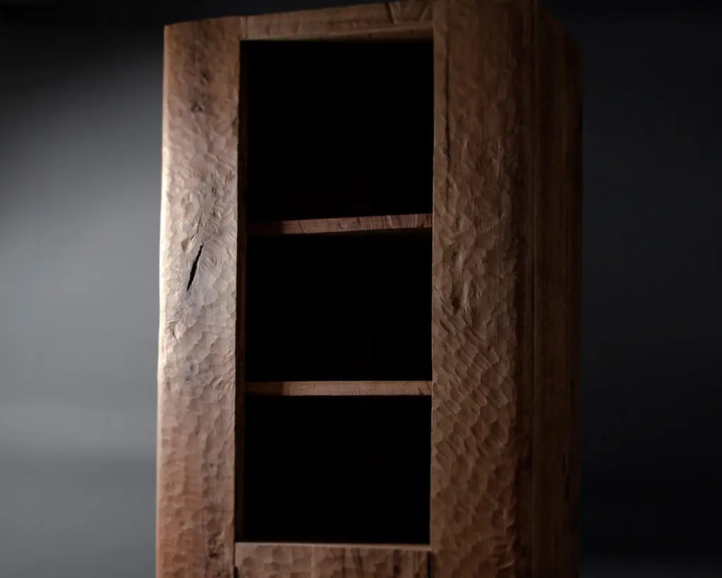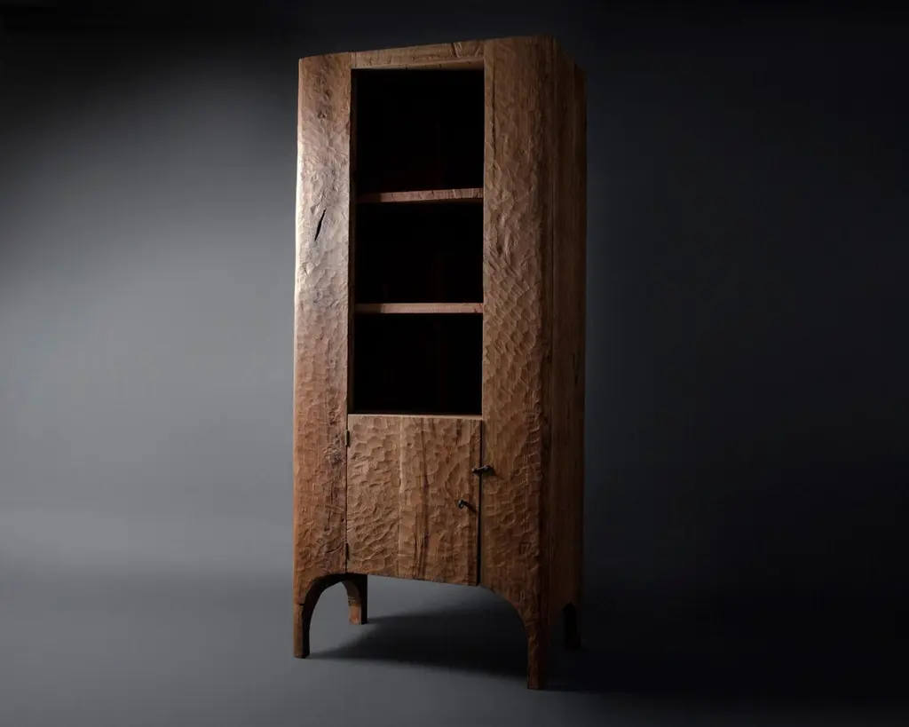 Cupboard made of solid oak (+ linseed oil)Measures: 175 x 80 x 40 cmSÓHA design studio conceives and produces furniture design and decorative objects in solid oak in an authentic style. Inspiration to create all these items comes from the Russian North aesthetics with its severe nature, log huts black from time and climate and scant patterns. Wood is masterfully hand processed with chainsaw or chisel, whereby producing beautiful surface patterns. The wood is soaked in boiling baths of linseed oil, creating this special patina and making each creation a very unique piece. Reacting with tanning substances under high temperature, oil gives the objects expressive and natural colours, from light brown to charcoal-black. SÓHA offers a vast array of neo-primitivist interior objects. Our kitchen utensil, wall panels, sculptures and furniture solutions are executed in one unique style and will organically fit into the interior of your home. Each piece is one-of-a-kind handmade product.Unique piece made to order.