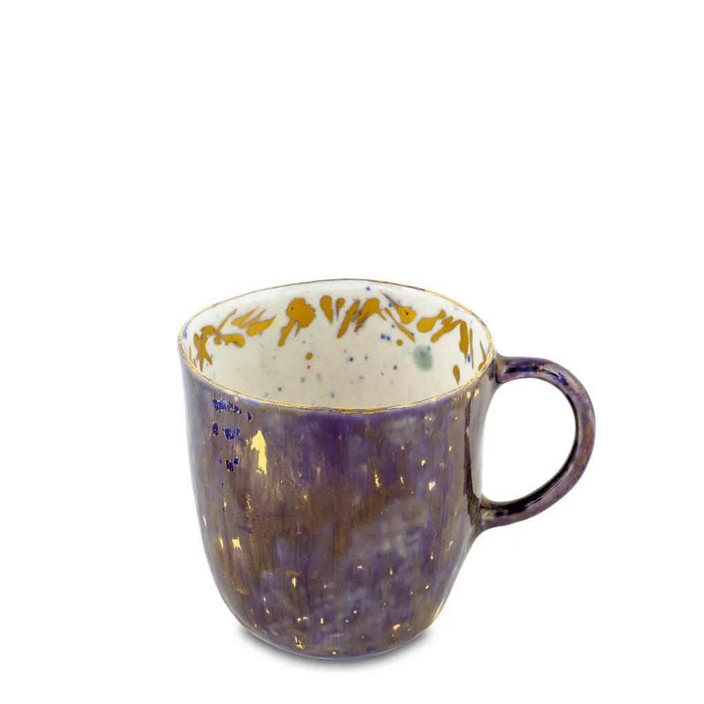 Handcrafted in Italy from the finest porcelain, Coralla's mugs are of her own design and a symbol of her work. Outside, this Apollo Bianco Coralla's Mug has a deep blue décor enriched by golden nuggets, like a starry night; the inside is painted in white enamel surrounded by a playful golden festoon and animated by colored dots.Set of 2 Coralla's mugs, 20clVilla Borghese, Apollo Bianco collectionHand painted porcelainHand painted 24-karat GoldMade in ItalyFirst introduced at Milan Design Week 2018, the Apollo collection is named after a hall of the Borghese Gallery in Rome and evokes Renaissance and Baroque art eternal beauty underlined by the gold finishes. Each Coralla Maiuri product is entirely hand decorated. Each is a work of art. While consistent, they are never identical. Slight variations of decor and color from one to another are not only normal, but to be expected as a sign of their uniqueness.Other sizes are available for the Apollo Bianco collection, please refer to other listings under the Coralla Maiuri brand.For large quantities, production lead time to be confirmedEven if all our tableware products are suitable for dishwasher machines, for long term conservation we warmly recommend to favour non-aggressive soap and delicate washing.Due to the presence of real 24-karat gold, this item is not suitable for microwave.