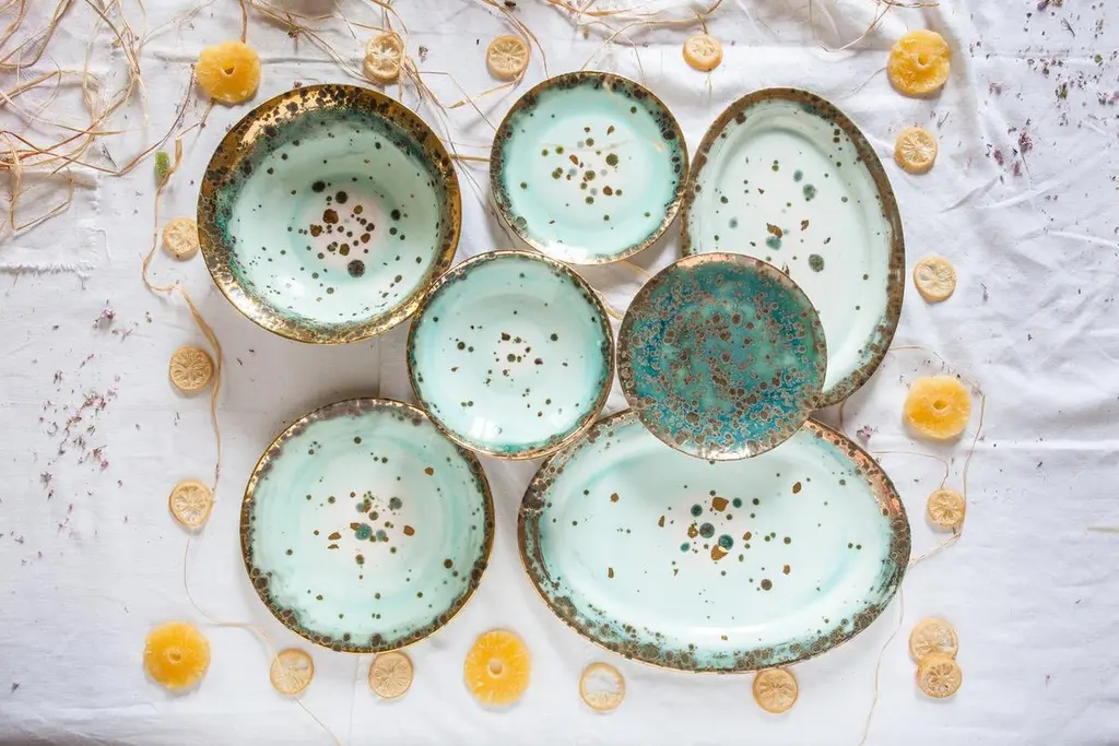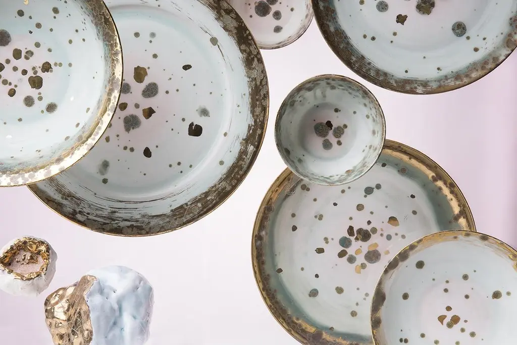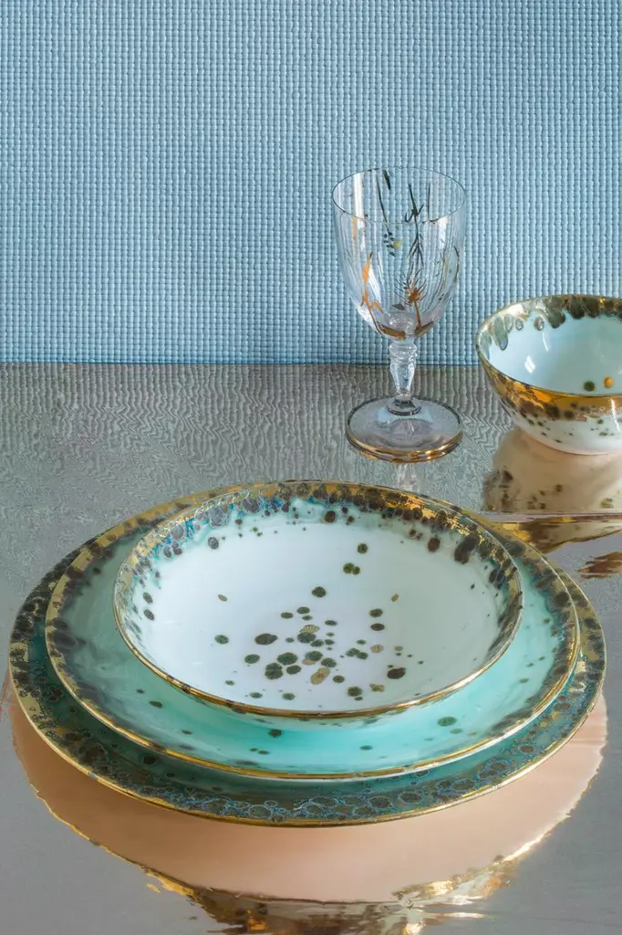 Hand painted in Italy from the finest porcelain, this Michelangelo Dessert Coupe Plate is material and earthy, like the great Renaissance Master's work. It conveys classical beauty and elegance. The green enamelled shade fades as it moves away from the rim towards a light pink center. Golden and green dots and splotches float like leaves on a romantic pond. The rim is surrounded by a broad golden decor.Set of 2 dessert coupe plates, Ø22 - 8.7inVilla Borghese, Michelangelo CollectionHand painted porcelainHand painted 24-karat goldMade in ItalyFirst introduced at Milan Design Week 2018, the Michelangelo Collection is named after a hall of the Borghese Gallery in Rome and evokes the eternal beauty of Renaissance and Baroque art, underlined by the gold finishes. Each Coralla Maiuri product is entirely hand decorated. Each is a work of art. While ensuring consistency, they are never identical. Slight variations of decor and color from one to another are not only normal, but to be expected as a sign of their uniqueness.For large quantities, production lead time to be confirmedEven if all our tableware products are suitable for dishwasher machines, for long term conservation we warmly recommend to favour non-aggressive soap and delicate washing.Due to the presence of real 24-karat gold, this item is not suitable for microwave.