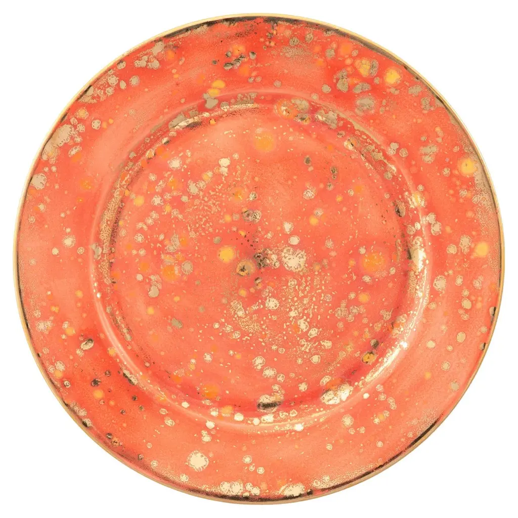 Hand painted in Italy from the finest porcelain, this Scipione red dessert plate is enameled with a brilliant African red décor, enriched by intertwining golden nuggets and brushstrokes and a thin golden rim.Set of 2 dessert coupe plates, red, measures: Ø22cmVilla Borghese, Scipione collectionHand painted porcelainHand painted 24-karat goldMade in ItalyFirst introduced at Milan Design Week 2018, the Scipione line is named after a hall of the Borghese Gallery in Rome and evokes ancient Roman military might.Each Coralla Maiuri product is entirely hand decorated. Each is a work of art. While ensuring consistency, they are never identical. Slight variations of decor and color from one to another are not only normal, but to be expected as a sign of their uniqueness.For large quantities, production lead time to be confirmedEven if all our tableware products are suitable for dishwasher machines, for long term conservation we warmly recommend to favor non-aggressive soap and delicate washing.Due to the presence of real 24-karat gold, this item is not suitable for microwave.