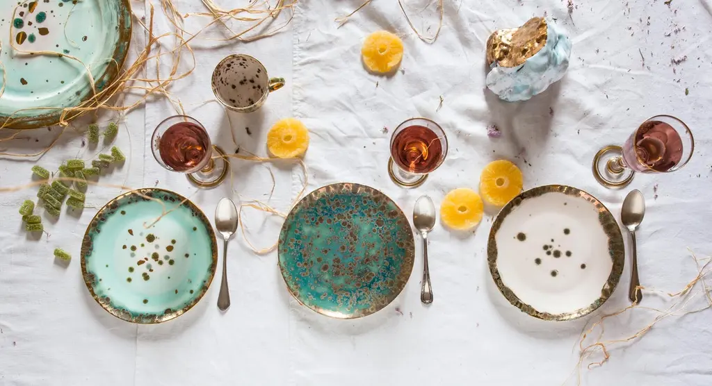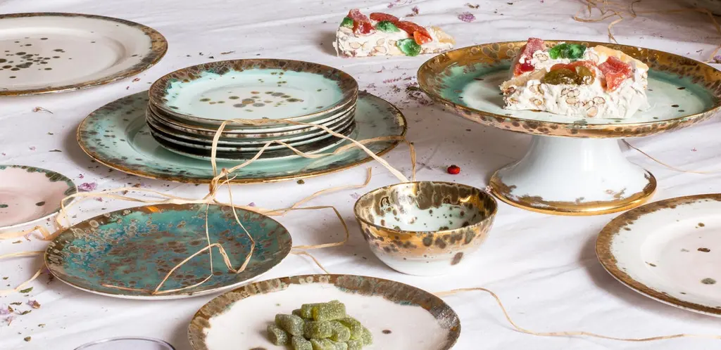 Hand painted in Italy from the finest porcelain, this Michelangelo green dessert coupe plate is material and earthy, like the great Renaissance Master's work. It conveys classical beauty and elegance. The green painted enamel with varying shades is covered by casual golden splotches, attracted by the rim where they coalesce.Set of 2 green dessert coupe plates, size: Ø 22Villa Borghese, Michelangelo collectionHand painted porcelainHand painted 24-karat goldMade in ItalyFirst introduced at Milan Design Week 2018, the Michelangelo collection is named after a hall of the Borghese Gallery in Rome and evokes the eternal beauty of Renaissance and Baroque art, underlined by the gold finishes. Each Coralla Maiuri product is entirely hand decorated. Each is a work of art. While ensuring consistency, they are never identical. Slight variations of decor and color from one to another are not only normal, but to be expected as a sign of their uniqueness.For large quantities, production lead time to be confirmedEven if all our tableware products are suitable for dishwasher machines, for long term conservation we warmly recommend to favour non-aggressive soap and delicate washing.Due to the presence of real 24-karat gold, this item is not suitable for microwave.