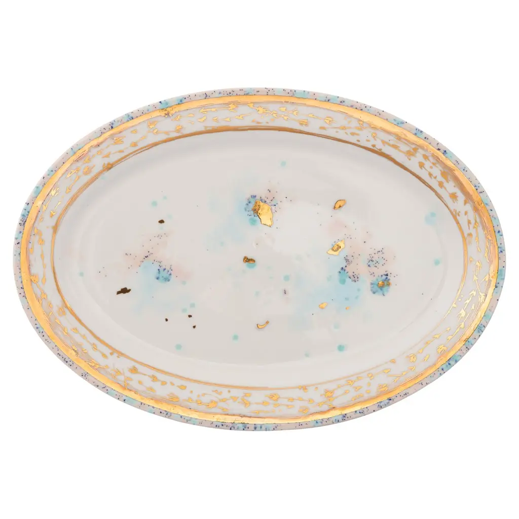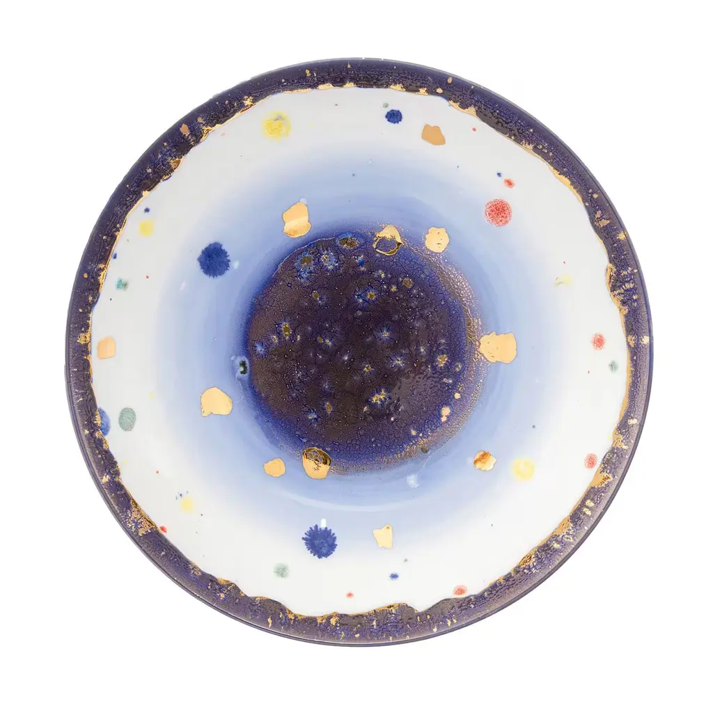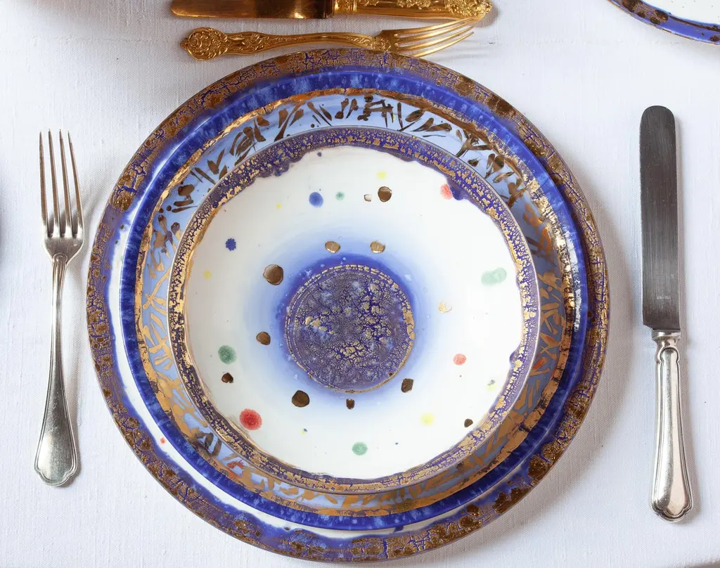 Handcrafted in Italy from the finest porcelain, this Apollo Bianco plate leads us into a magic world. Shades of blue lapis lazuli evoke the magic of oriental novellas. A fairytale is revealed by playful nuggets of gold, green red and blue drifting in the bright sky surrounded by a a precious golden halo and a blue rim.Set of 2 dinner coupe plates, measures: Ø 27Villa Borghese, Apollo Bianco collectionHand painted porcelainHand painted 24-karat goldMade in ItalyFirst introduced at Milan Design Week 2018, the Apollo Collection is named after a hall of the Borghese Gallery in Rome and evokes Renaissance and Baroque art eternal beauty underlined by the gold finishes. Each Coralla Maiuri product is entirely hand decorated. Each is a work of art. While ensuring consistency, they are never identical. Slight variations of decor and color from one to another are not only normal, but to be expected as a sign of their uniqueness.Other sizes are available for the Apollo Bianco collection, please refer to other listings under the Coralla Maiuri brand.For large quantities, production lead time to be confirmedEven if all our tableware products are suitable for dishwasher machines, for long term conservation we warmly recommend to favour non-aggressive soap and delicate washing.Due to the presence of real 24-karat gold, this item is not suitable for microwave