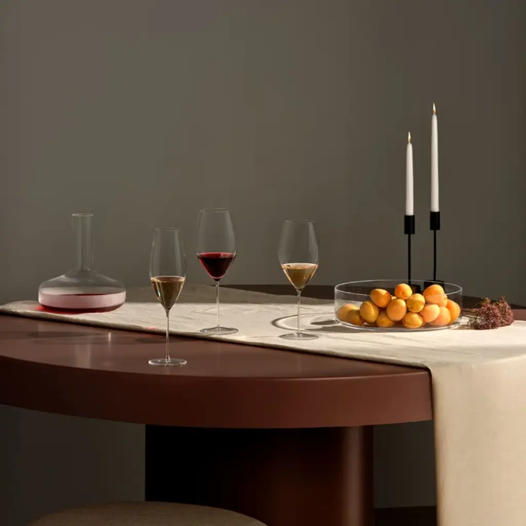 The Contour carafe, while echoing the spirit of the original Contour collection, has a sandblasted base, frosting the glass which, in the decanter’s case, is semi-translucent.