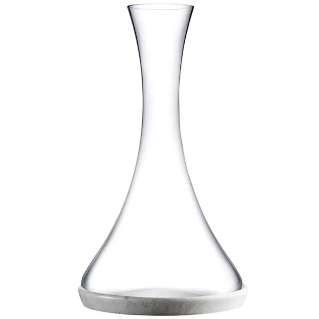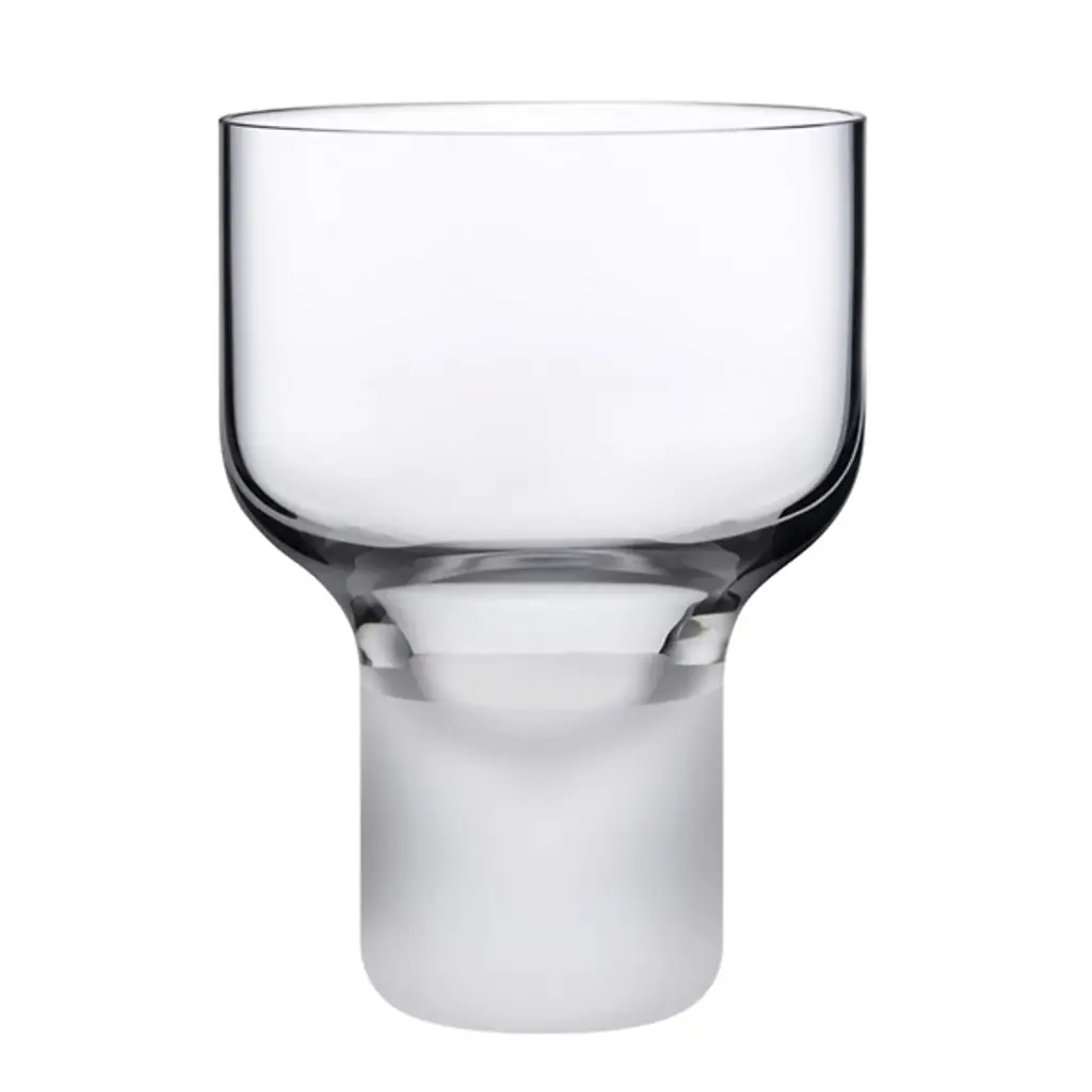 The Contour Wine Carafe from Nude combines a sandblasted lower portion with a clear crystal neck that extends upward dramatically. Created by Pentagon Design in Turkey, the lead-free crystal construction features varying glass densities that create subtle transitions between sections. The contrasting finishes produce a layered appearance while maintaining the collection's minimalist aesthetic throughout the sculptural form.