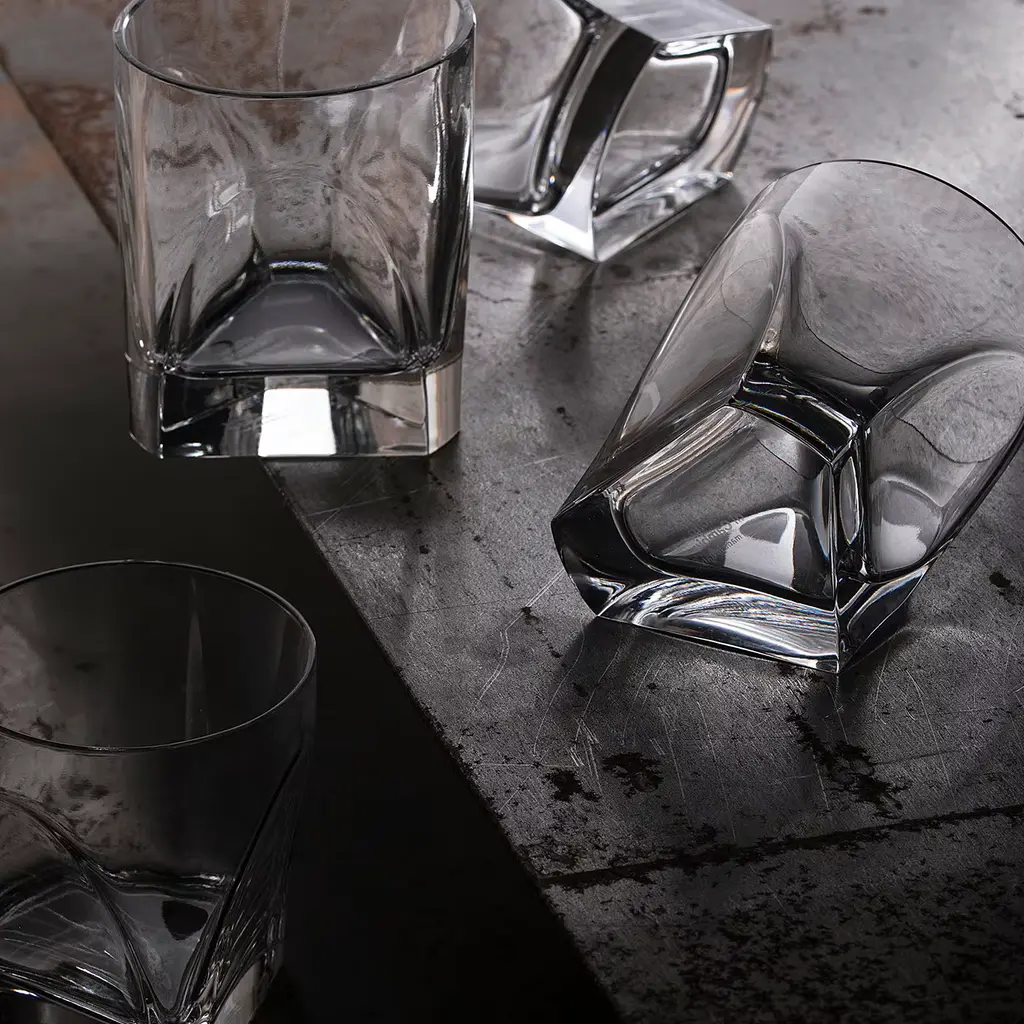The concept behind the Conversazione Collection designed by Enzo Mari in 1999 is a different base for every piece, creating an open dialogue between the volumes that are both harmonious and visually intriguing. This set comprises four double old fashion glasses with a sculptural shape entirely made of crystal and lateral cuts that allows a firm grip. Sophisticated and modern, this set will infuse elegance on any occasion and can be combined with the others in the same series for a cohesive look. Each glass is H 9.6 x D 8.2 mm, with a capacity of 28 cl. This piece is currently on show and immediately available at Artemest Galleria New York.