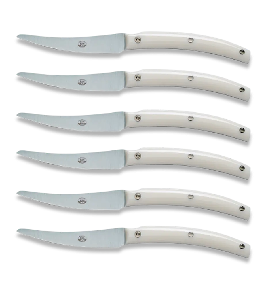 The Convivio Steak Knife set is a classic collection by the Florentine family-owned business Coltellerie Berti. Handmade from beginning until end, each item is an heirloom individually crafted and signed by the artisan who made it. The knives are made of a stamped stainless steel blade and a lucite handle, components which seemingly flow together in an “S”-shaped curve. Elegant enough for a holiday party and durable enough to hold up to everyday use, the knives are a beautiful and practical addition to the table. The six-piece set comes in a natural wooden box for storage and display.