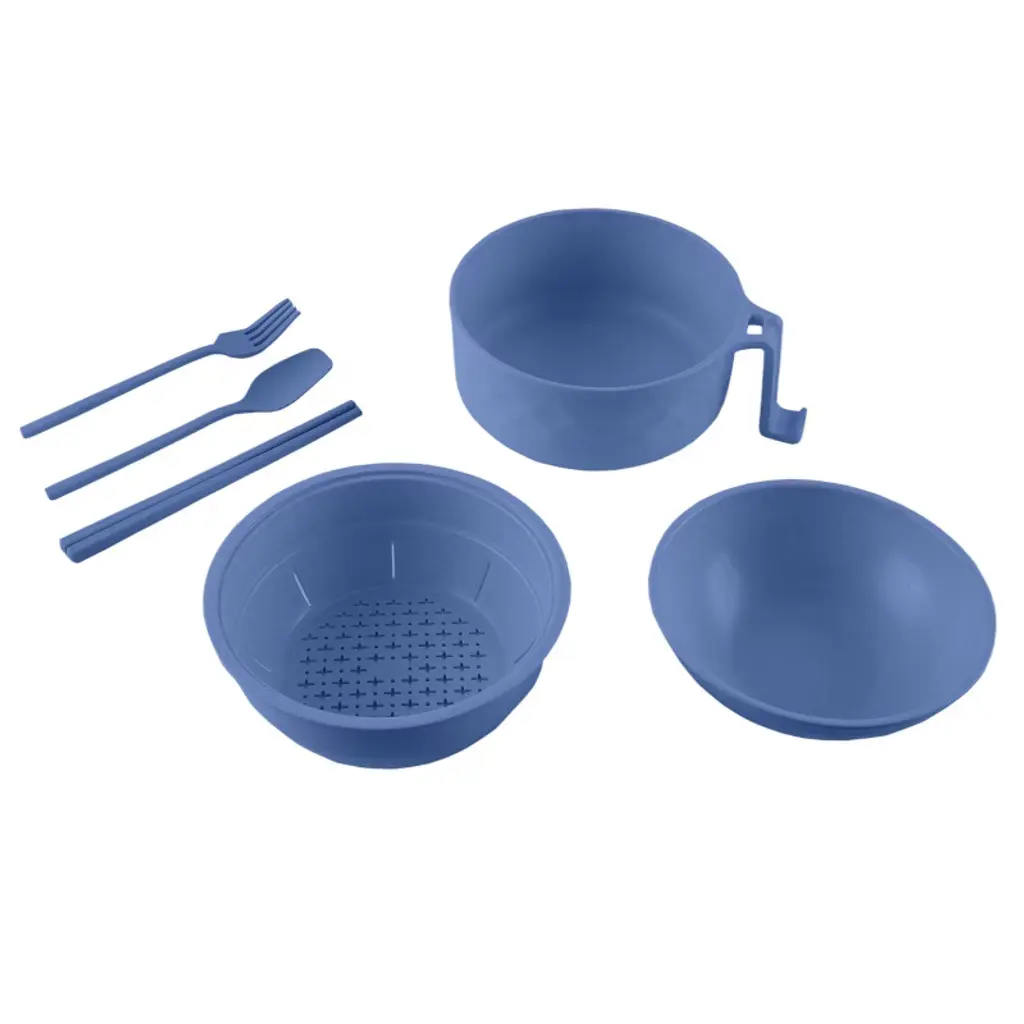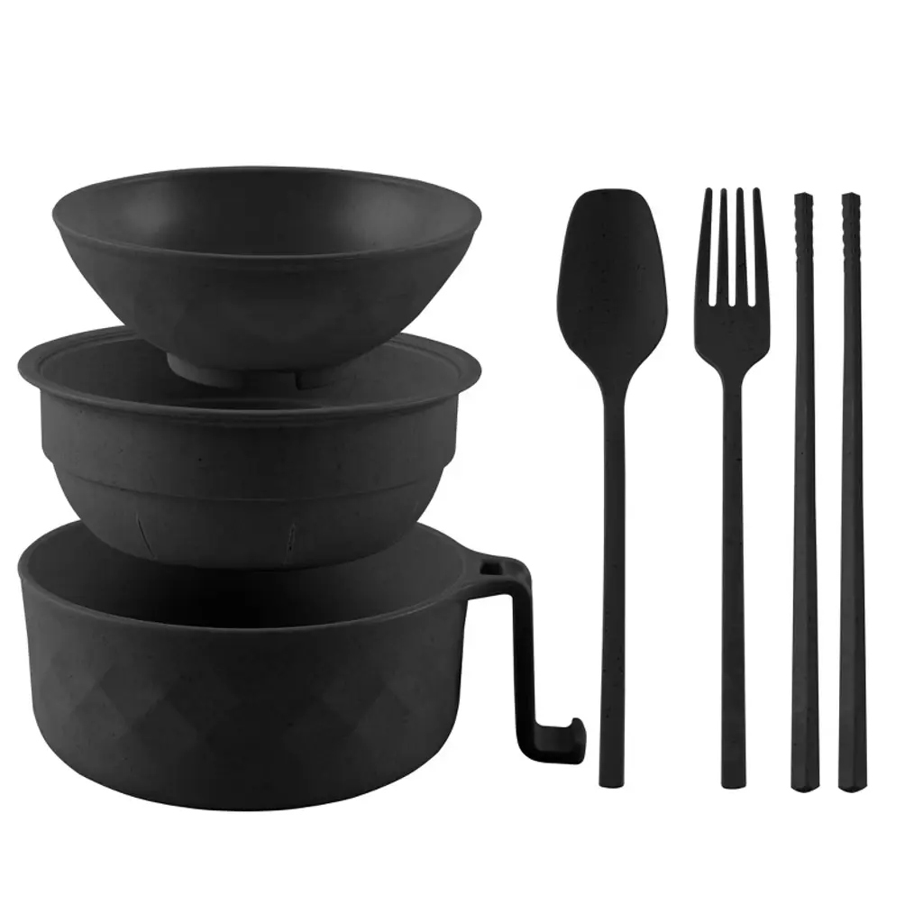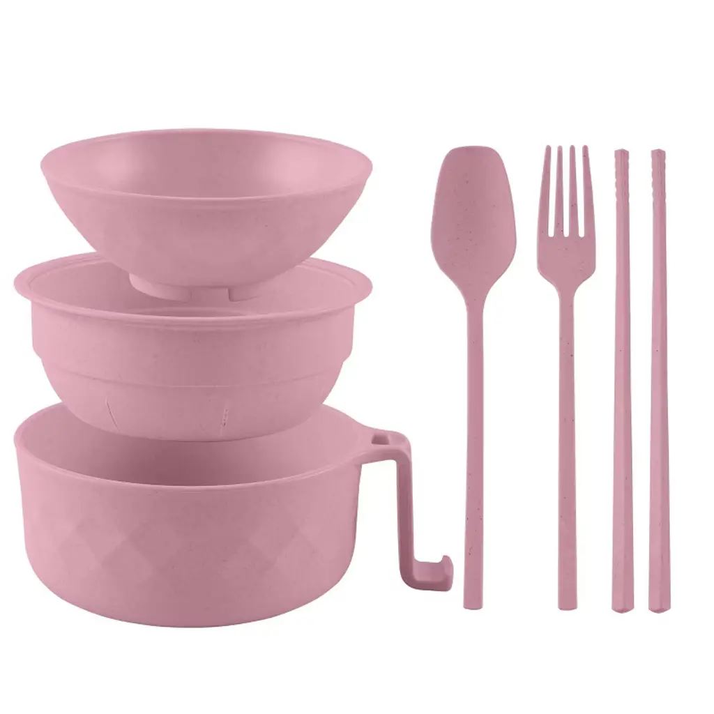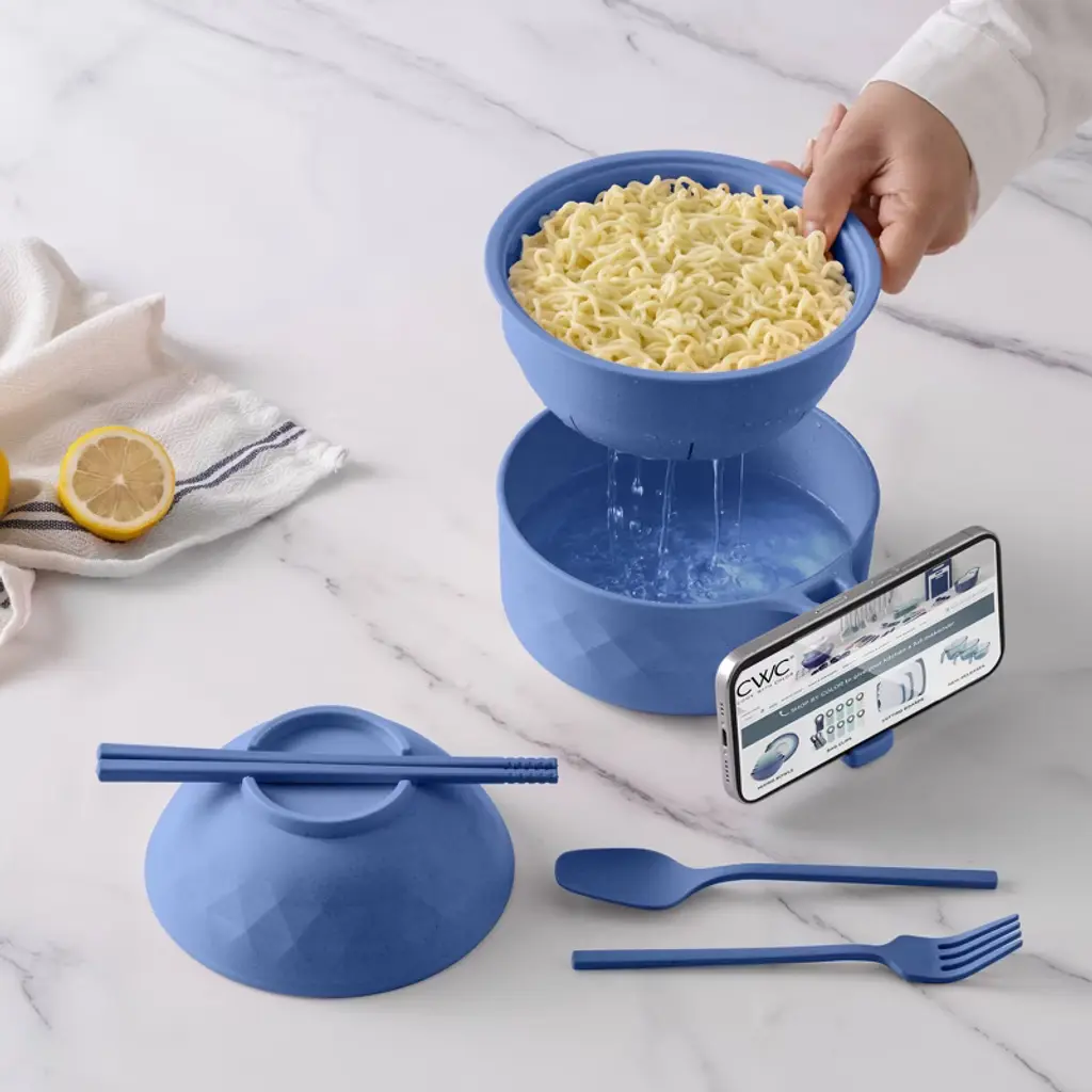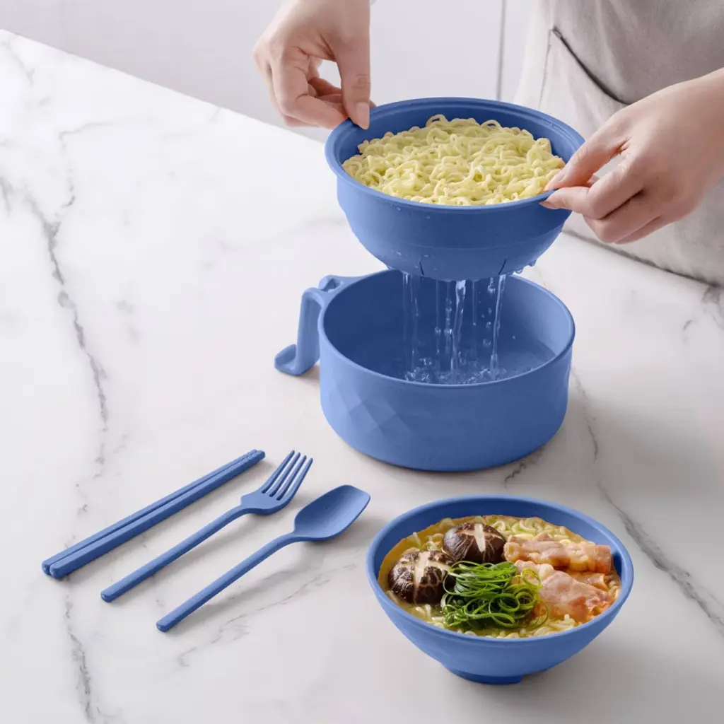 This microwavable ramen bowl set offers a convenient all-in-one solution for enjoying your favorite noodle dishes at home, in the office, or on the go. The set includes a large, microwave-safe bowl perfect for heating and serving ramen, a matching cup for broth, drinks, or dipping sauces, and a strainer insert that makes draining noodles quick and easy. To complete the experience, it also comes with a set of reusable chopsticks and a versatile fork and spoon combo, providing multiple eating options. Made from durable, BPA-free plastic, each piece is designed for ease of use, easy cleaning, and everyday functionality. Whether you're prepping a quick lunch or savoring a cozy meal, this set brings convenience and style to your table.