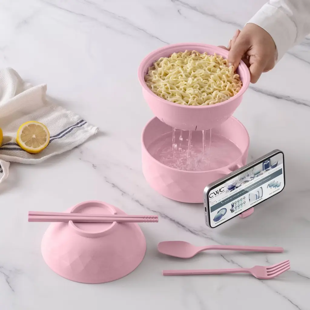 This microwavable ramen bowl set offers a convenient all-in-one solution for enjoying your favorite noodle dishes at home, in the office, or on the go. The set includes a large, microwave-safe bowl perfect for heating and serving ramen, a matching cup for broth, drinks, or dipping sauces, and a strainer insert that makes draining noodles quick and easy. To complete the experience, it also comes with a set of reusable chopsticks and a versatile fork and spoon combo, providing multiple eating options. Made from durable, BPA-free plastic, each piece is designed for ease of use, easy cleaning, and everyday functionality. Whether you're prepping a quick lunch or savoring a cozy meal, this set brings convenience and style to your table.