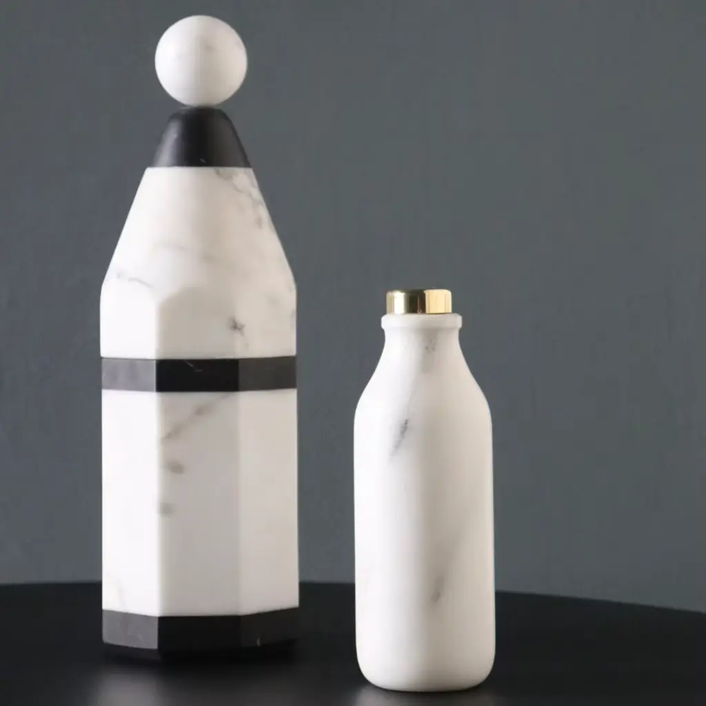 This striking bottle is part of the Coolers collection, featuring a mix of minimalist designs and precious materials, traditional crafting methods and a contemporary sensibility, and resulting in bottles that are stunning to behold and useful, since they preserve the temperature of the liquid they contain, without the use of ice. In this case, the surface of the piece is in Arabescato marble with horizontal inserts in Marquina marble for a timeless look. Inside, the bottle is in brass-finished glass.
