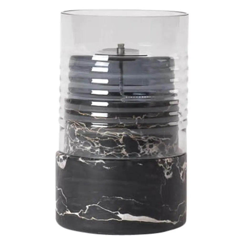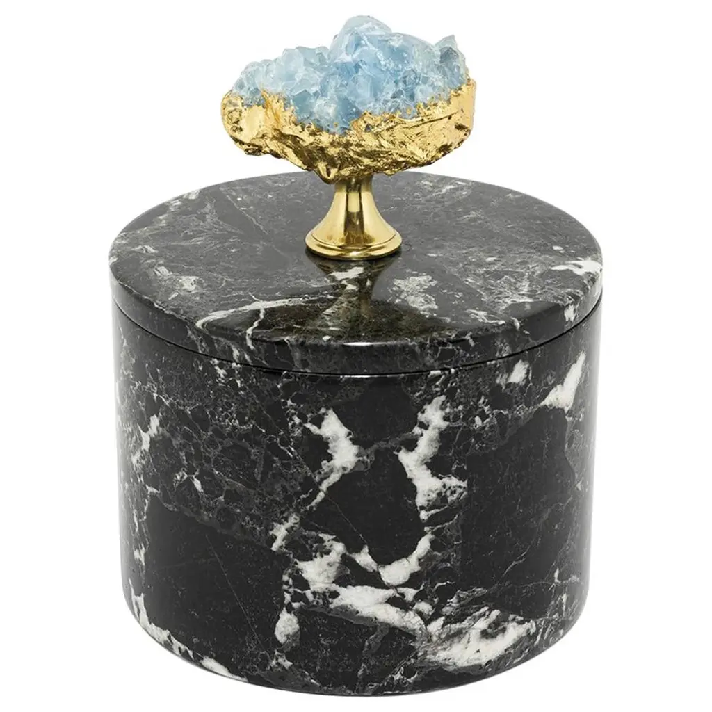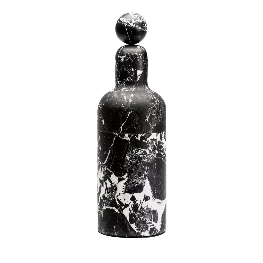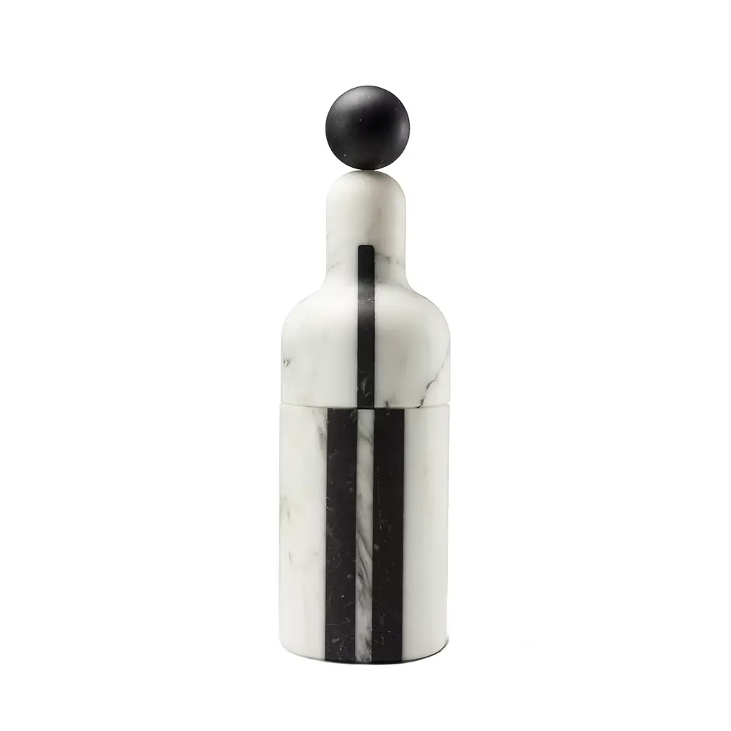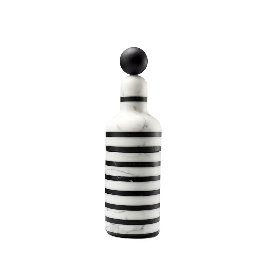 This stunning object of functional decor is a bottle cooler that can preserve its internal temperature without using any ice, thanks to its natural and precious material. The piece, whose silhouette is simple and timeless, is made of Arabescato marble with geometric inserts in Green Guatemala, whose vivid shade of green adds color to the piece. Inside, the bottle is lined with brass-finished glass. A perfect complement to any dining room, this object can be combined with other bottles from the Coolers collection.
