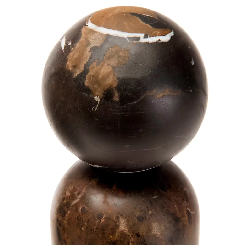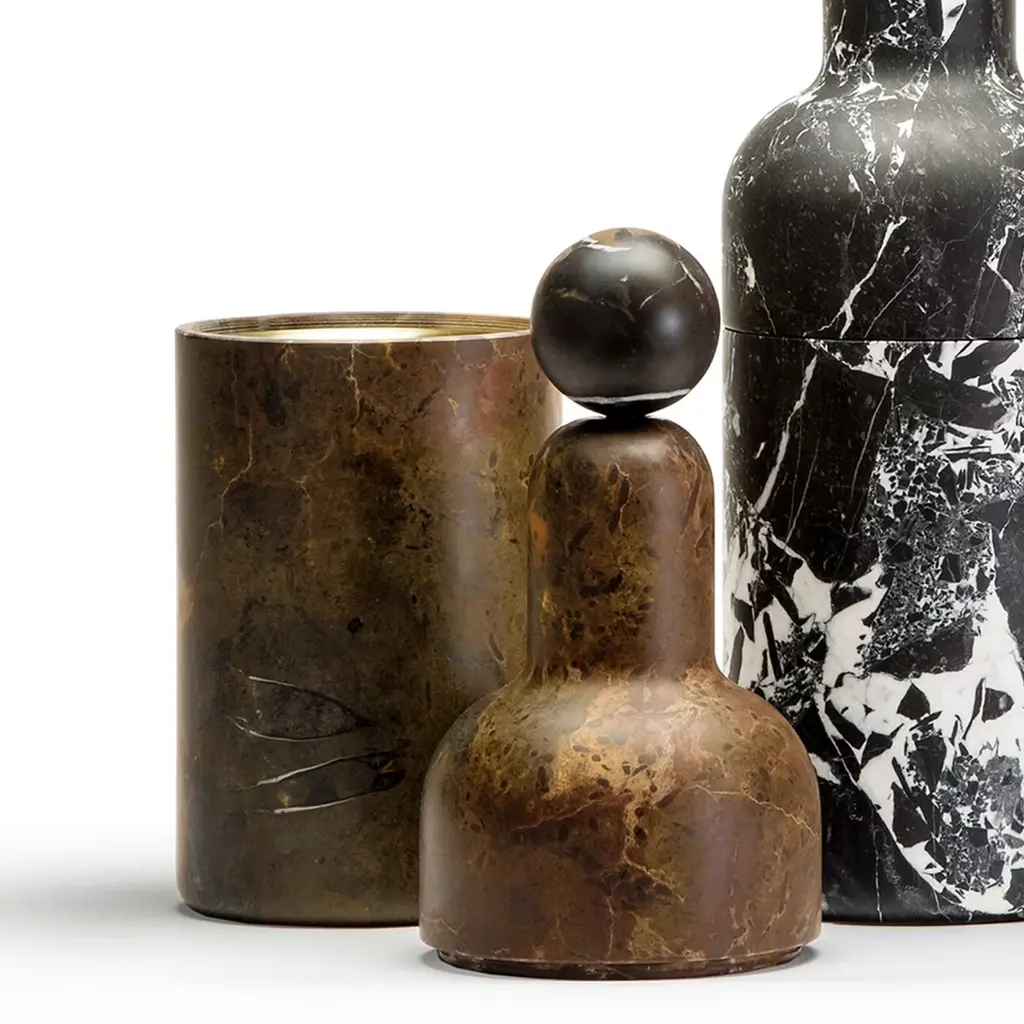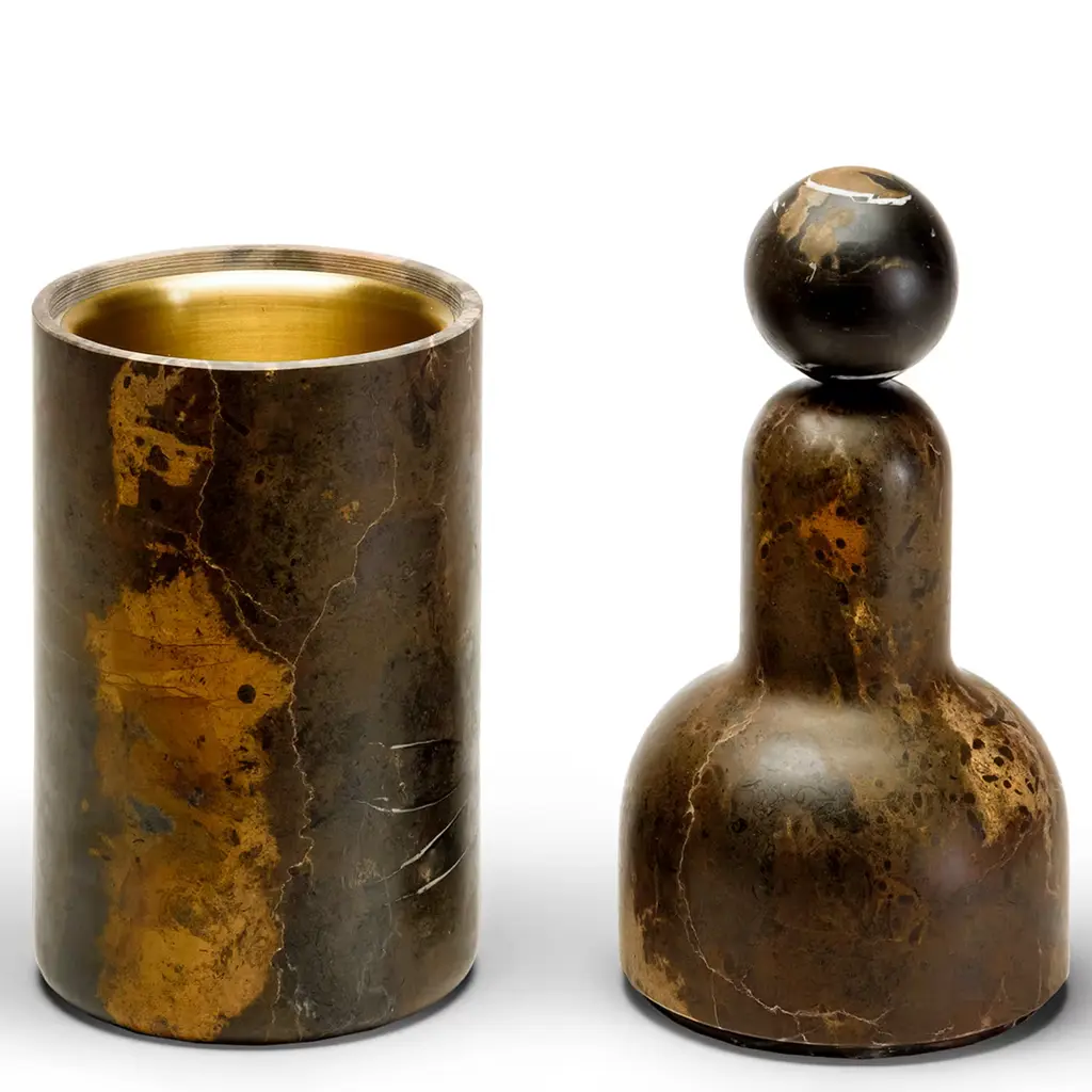 A superb addition to a personal collection, this bottle cooler will preserve the temperature of the bottle in the most natural way without using ice. Refined and luxurious, it is handmade of Black & Gold marble and opens in two perfect halves featuring a brass glass inside. Suitable for standard size wine and champagne bottles, it is embellished with a spherical finial.
