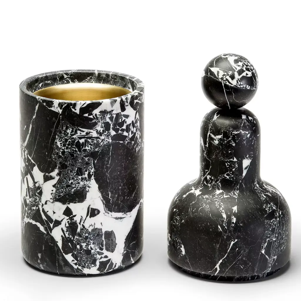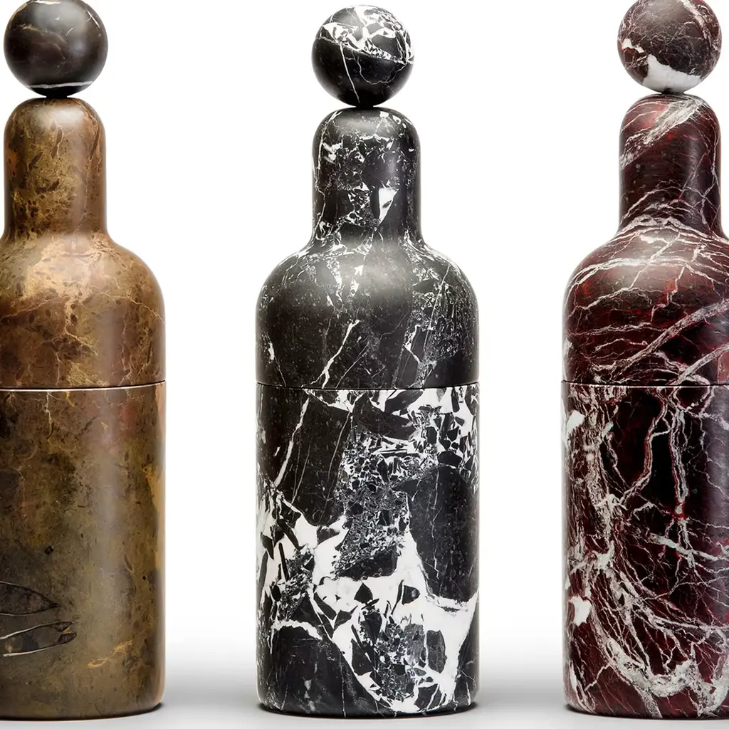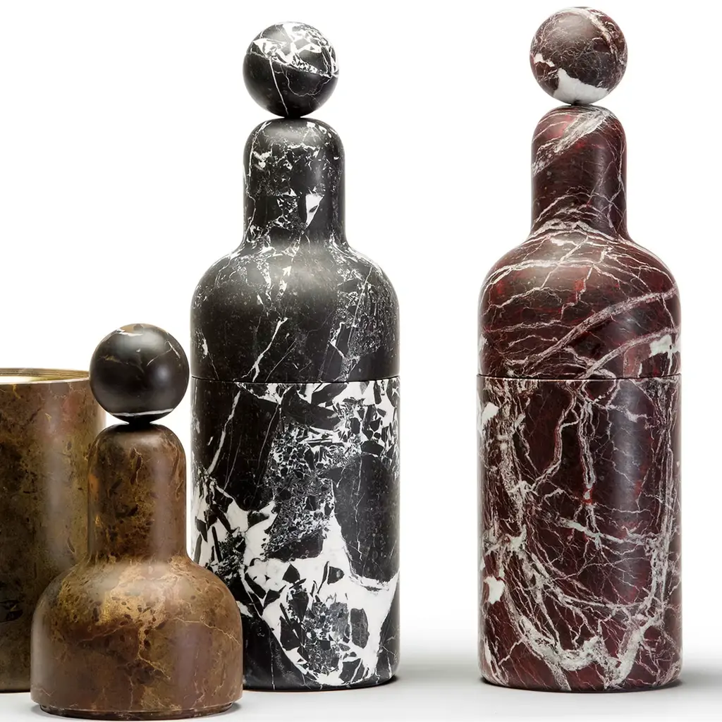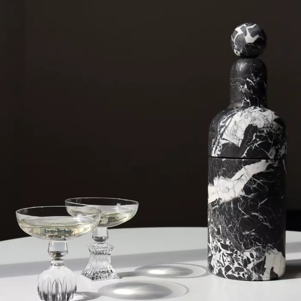 A functional object that is also a stunning piece of decor, this bottle cooler will be a precious addition to a bar cabinet and an exclusive gift on special occasions. Preserving the temperature of the wine and champagne bottles (standard size) in a natural way thanks to the insulation properties of marble, this cooler is handcrafted of prized Grand Antique marble and opens in half revealing a brass glass lining.