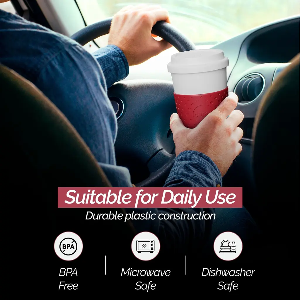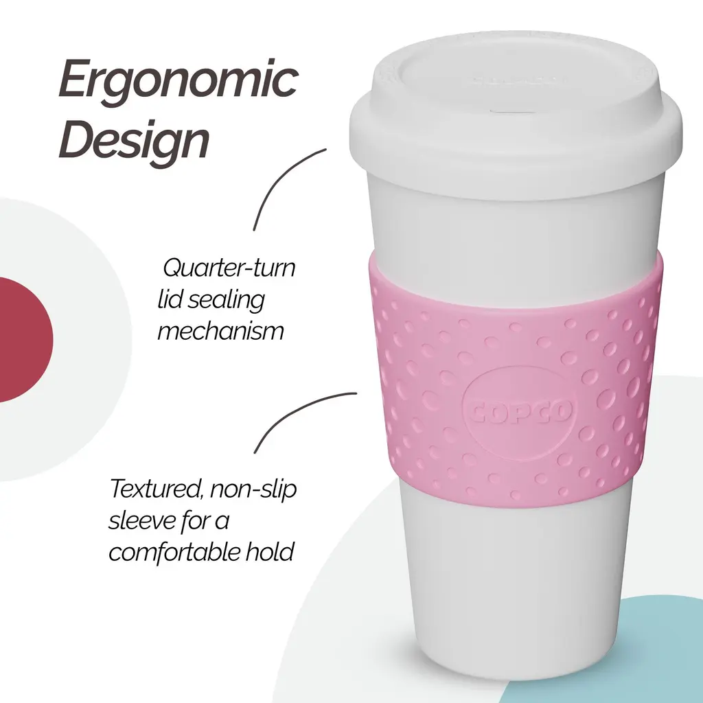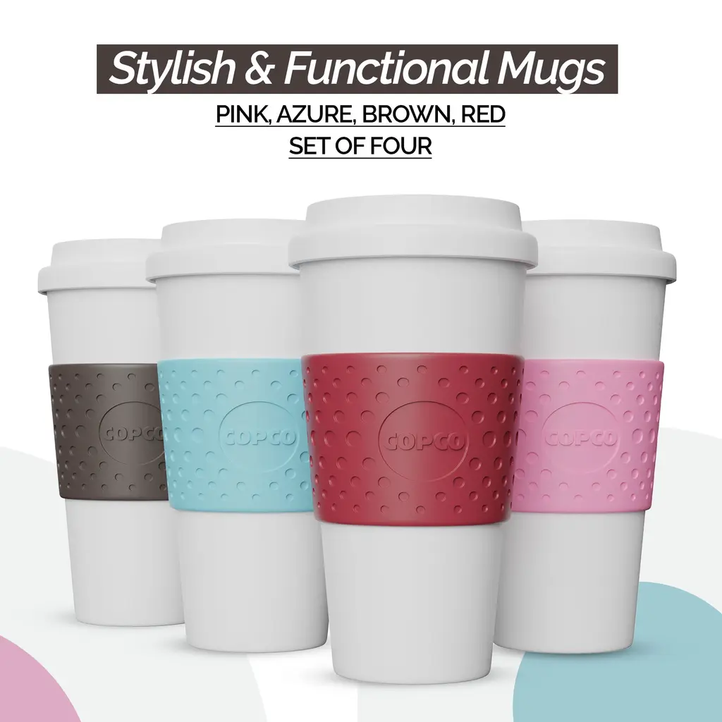 Copco Acadia Reusable To Go Mug Oz 4 Pack - NewCopco's reusable travel cup combines function and sleek design and easily replaces paper and Styrofoam coffee cups. Double-wall insulation keeps beverages hot or cold. Made from durable, Bpa-free plastic. The cup comes with a textured, non-slip sleeve. A quarter-turn lid sealing design helps prevent leaks and spills. Able to hold up to 16 ounces, the cup is microwave and dishwasher-safe. Set comes with 4 white travel mugs with colored easy grip non slip sleeves.Product specificsCompatibility: N/AOverall - Size: 16 oz. capacityMaterial: PlasticModel - Part Number: 5286816Brand: CopcoWarranty: N/A