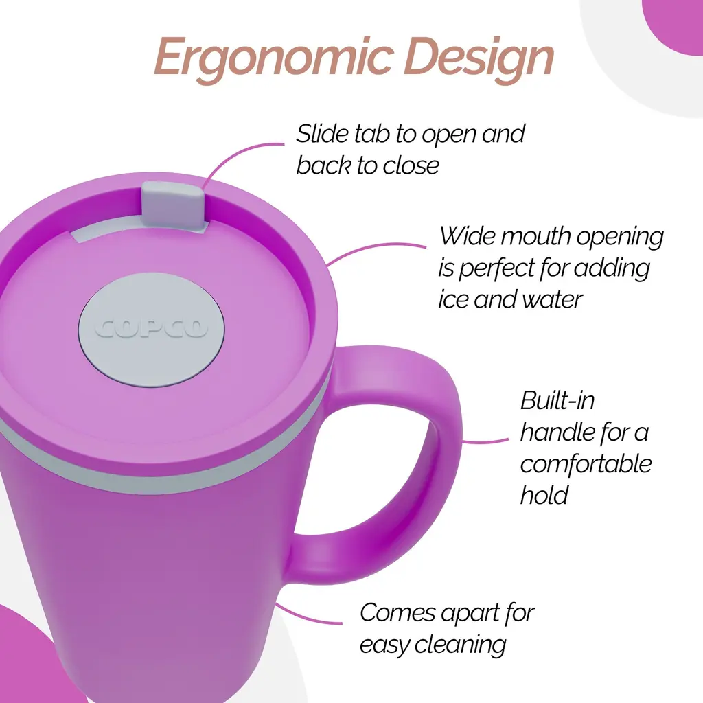 Copco Cone Travel Coffee Mug, 16 oz - Insulated Drinkware with Spill-Proof Lid and Handle, Microwave & Dishwasher Safe - BPA-Free, Compact for Desk & Cup Holder Friendly - NewThe Copco Cone Travel Coffee Mug is an essential piece of insulated drinkware designed to make your daily beverage routine more enjoyable and convenient. With a 16-ounce capacity and double wall insulation, this mug keeps your favorite hot or cold drinks at the perfect temperature for longer, whether you’re at your desk, in the car, or relaxing at home. This travel mug is designed for practicality, featuring a compact shape that fits comfortably into most car cup holders and under pod coffee machines for easy refills. The leak-resistant lid ensures spill-free use, while the ergonomic handle offers a secure, comfortable grip for sipping on the move or at your workspace. Constructed from BPA-free materials, this microwave and dishwasher safe mug simplifies your day by allowing easy reheating and hassle-free cleaning. The durable and stylish finish adds a touch of modern elegance to your drinkware collection, making it both functional and visually appealing. Whether you’re enjoying coffee during your commute or sipping tea at your desk, this insulated travel coffee mug adapts to your lifestyle. Perfect for a wide variety of beverages, including coffee, tea, and iced drinks, it’s a versatile solution for staying hydrated and energized throughout the day. Elevate your drinkware collection with the Copco Cone Travel Coffee Mug - the ideal choice for keeping your favorite beverages at the right temperature while offering the convenience and style you need for your busy life.FEATURES:MATERIAL:WHAT'S IN THE BOX:PACKAGING: Retail Packaging