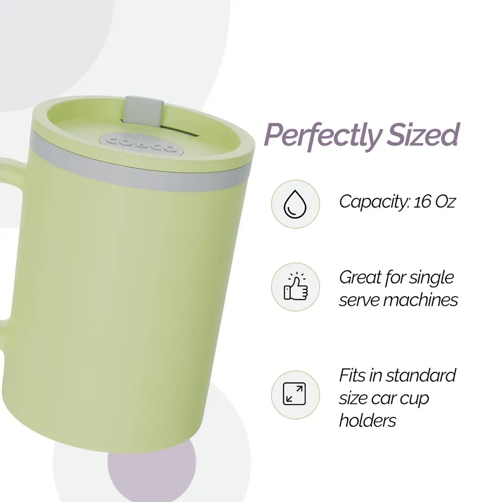 Copco Iconic 16 oz. Mug Set of 2 - NewThe Copco Iconic Mug holds the perfect iconic shape and is perfectly designed to fit under your "Pod" machines. Constructed with double wall insulation which keeps your beverages hot, fresh and tasty. The mug has a capacity of 16 ounces. Made out of BPA free plastic and comes in packs of two featuring cute pastel colors. The attached handle makes it easy to hold this mug to fully enjoy your hot drink. Microwave and dishwasher safe makes clean up super easy.FEATURES:MATERIAL:WHAT'S IN THE BOX:PACKAGING: Retail Packaging