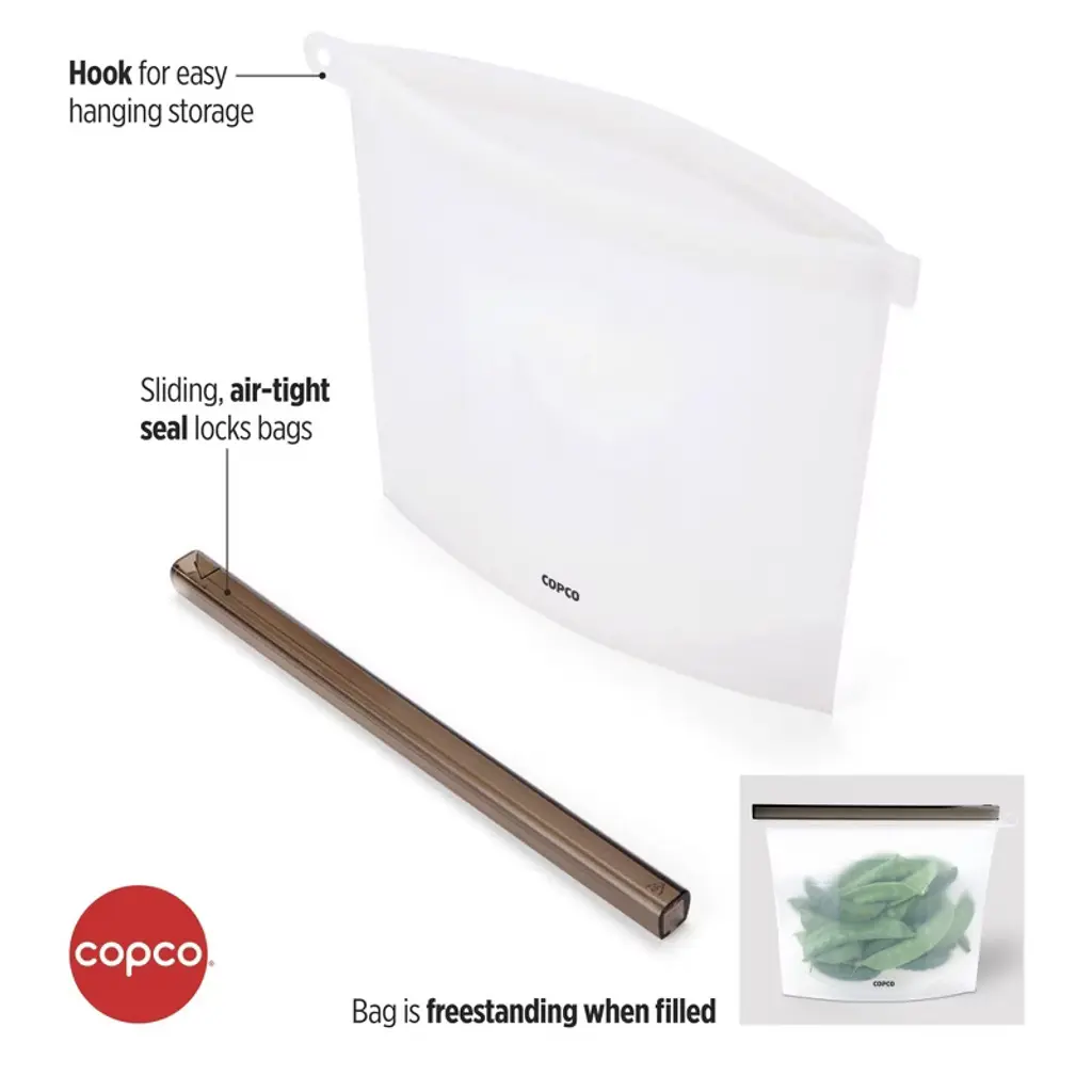 Introducing the Copco Silicone Food Grade Reusable Storage Bag, a versatile and eco-friendly solution for all your storage needs. Perfect for storing and reheating leftovers, freezing fruits and vegetables for meal prep, and packing food for lunches, this multipurpose bag is also ideal for organizing personal care items, art supplies, or office essentials. Its clear, resealable design allows you to quickly view contents, making it easy to find what you need without rummaging. The sliding lock securely fastens the bag to keep food fresh and prevent spills, while its ability to stand up when filled saves space in your fridge or pantry. Made from durable, food-safe silicone, this heavy-duty bag is designed to withstand frequent use, helping to significantly reduce plastic waste. It is BPA-free and safe for the freezer, microwave, and upper-rack dishwasher, making it a sustainable and practical choice for everyday use. Silicone storage bags like the Copco Silicone Food Grade Reusable Storage Bag offer unparalleled convenience for daily use. Their versatility makes them suitable for various applications, from kitchen storage to personal organization. The durable silicone construction ensures they can handle the rigors of everyday life, whether you’re freezing, microwaving, or cleaning them in the dishwasher. With their resealable and airtight design, these bags keep your food fresh and your storage spaces tidy, making them an essential addition to any home.