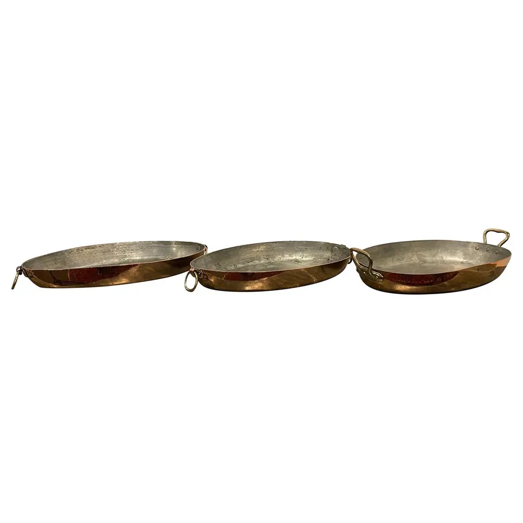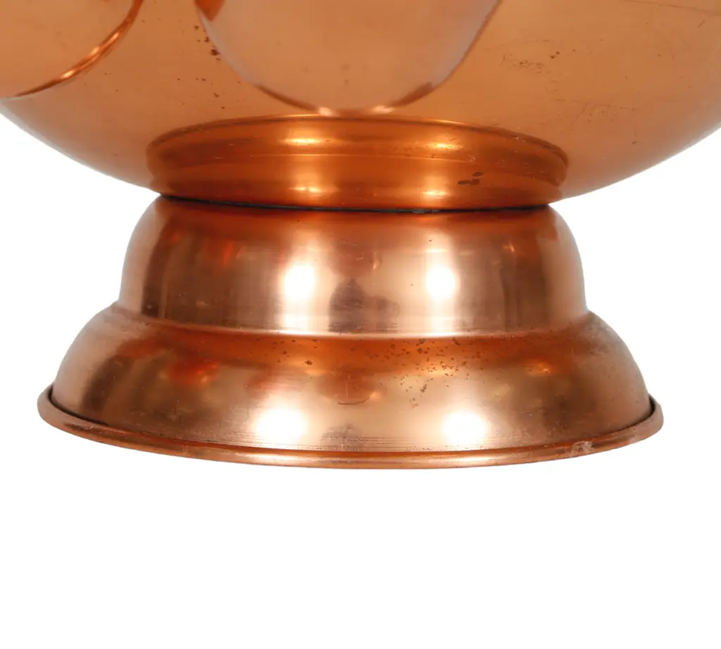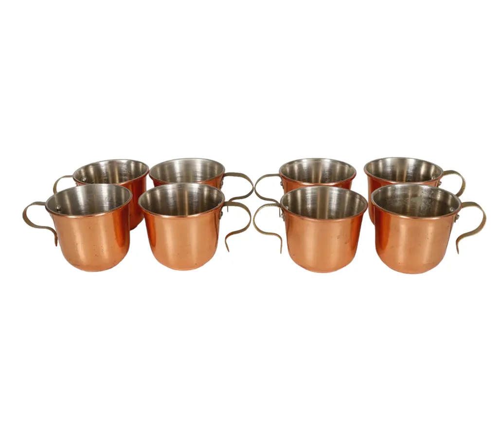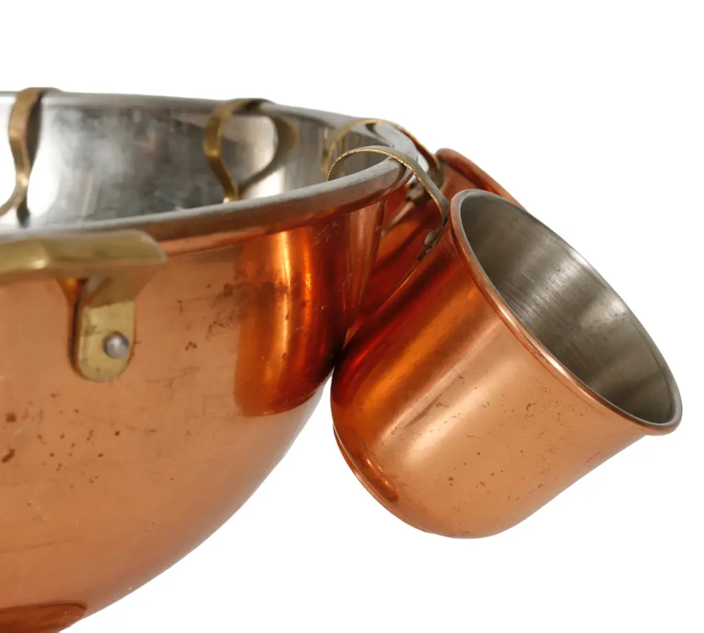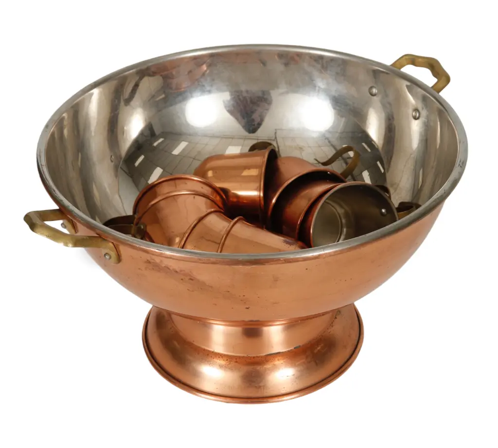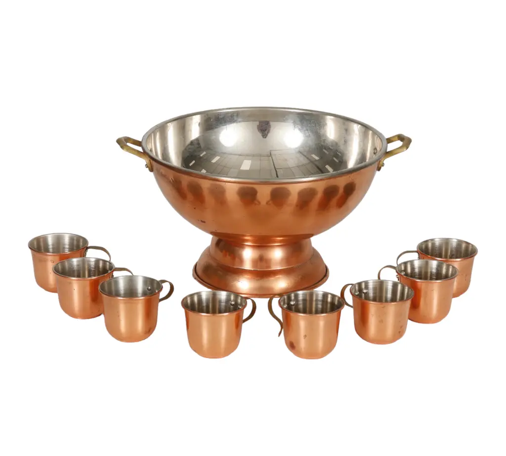 A copper punch bowl with a stainless-steel interior and two brass handles. Accompanied with eight copper mugs, also with stainless steel interiors, that hang on the edge of the bowl with brass handles. Bowl measures 12"W x 12"D x 7"H, cups measure 3.75"W x 2.75"D x 2.5"H.