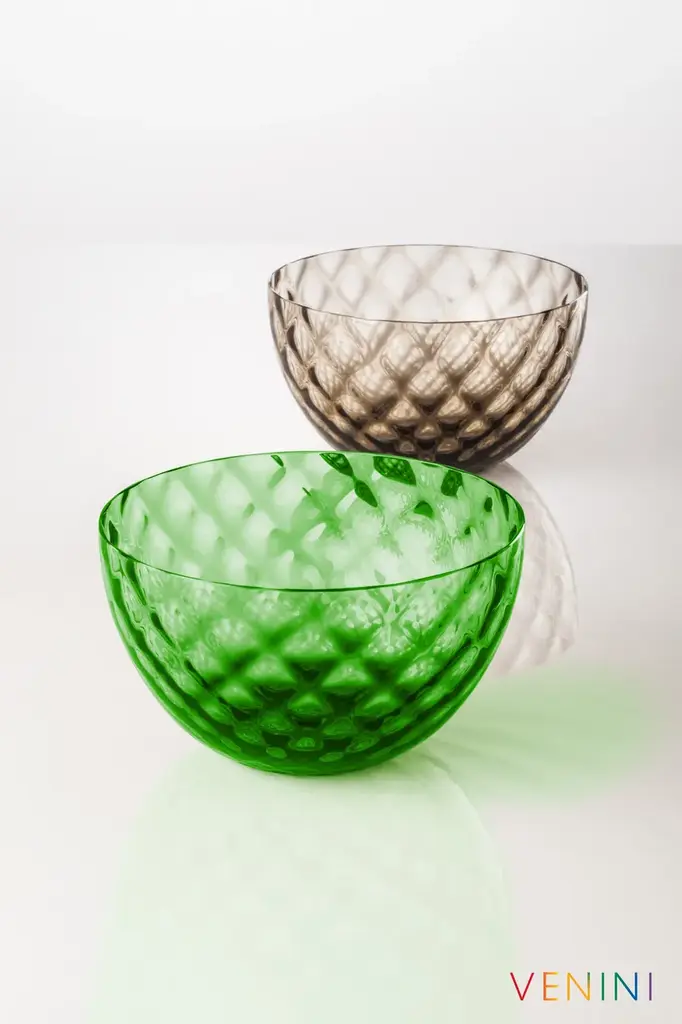 Coppetta Carnevale is a blown glass bowl handcrafted with the traditional balloton processing with metal mold, for a cross relief effect. Like the icons that inspired them, these pieces are made using the Balloton technique. Every Coppetta Carnevale is a small handcrafted creation; glass is blown using traditional metal molds, creating a unique crossed relief optical effect on its surface. Colourful and lively, it is always ready to party.Colors:GREY BallotonGREEN BallotonArt, Colour, Quality, Uniqueness and Craftsmanship are the cornerstones of all VENINI glass creations. But VENINI is also the brand able to satisfy with excellent solutions gift ideas, monofloras, cups, objects for every occasion: anniversaries, Christmas, also suitable for multiple needs. Precious emotions through style and design.