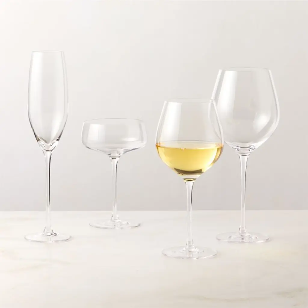A true modern classic, the Coppia handblown white wine glass features a traditional silhouette while maintaining a modern edge. Made of ultra-thin crystalline glass, the soft almond shape gently curves into the stem, keeping the look modern. CB2 exclusive.