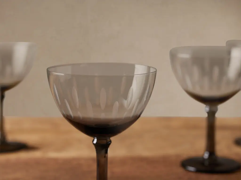 The Cora Collection’s smoky grey colored glass features contrasting cut details to add both visual interest and elegance to any table setting. Set of four cocktail glasses.