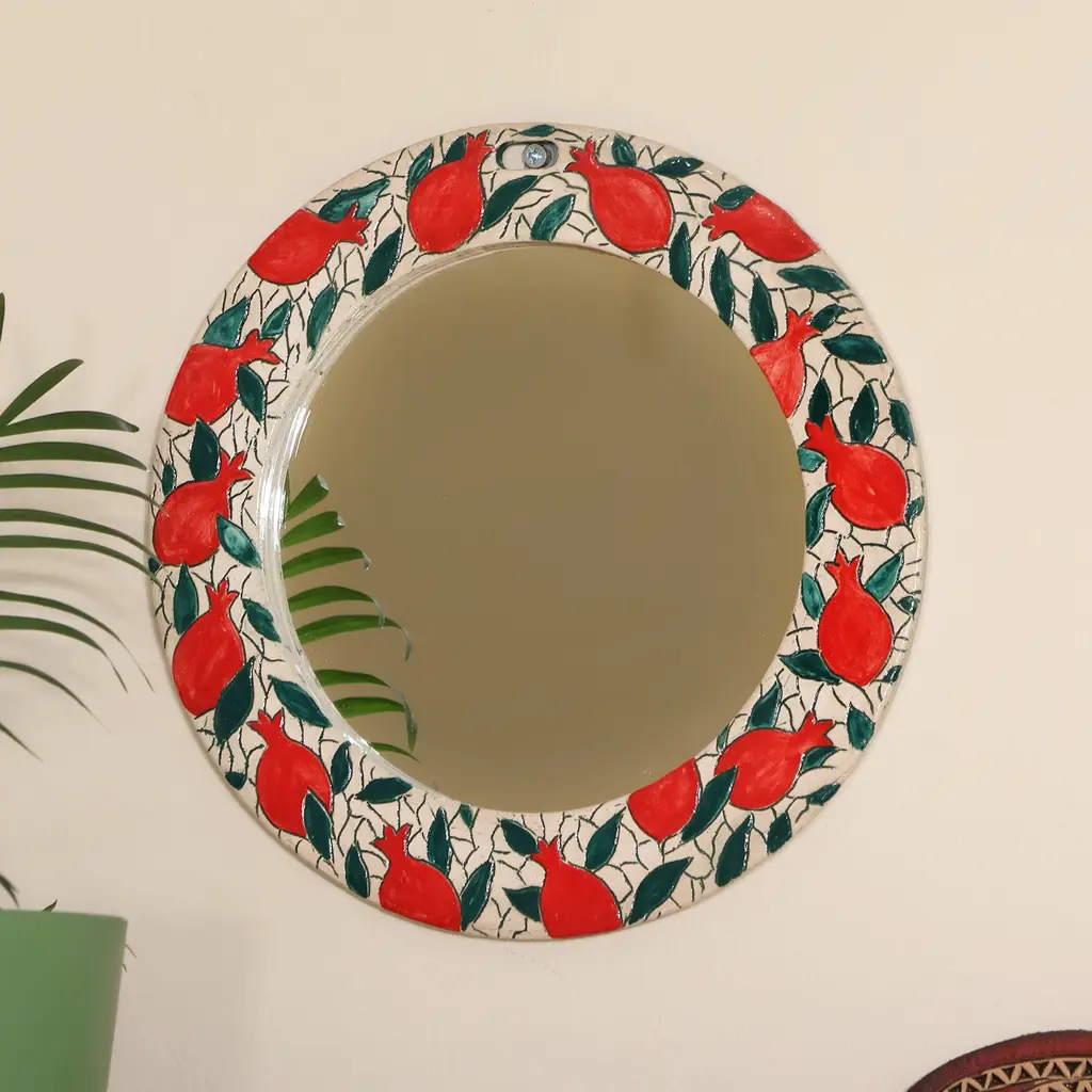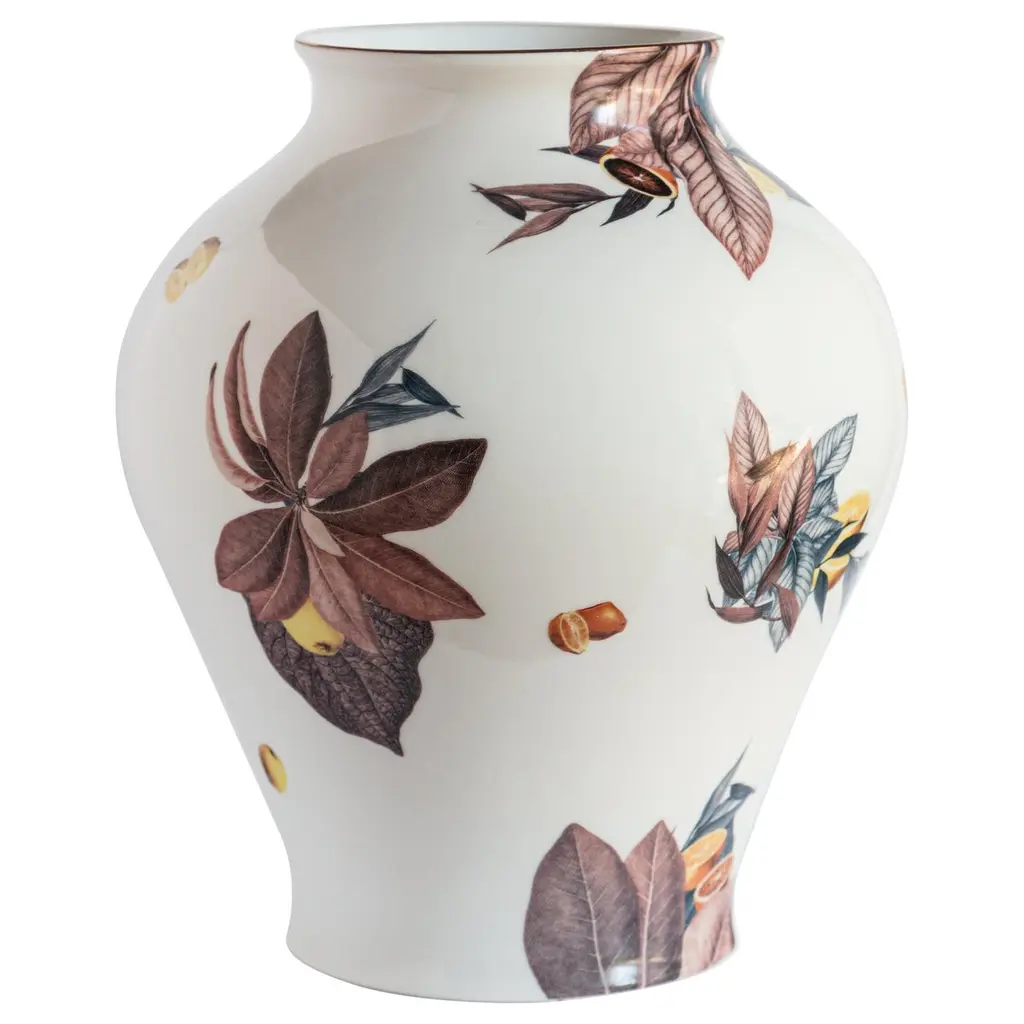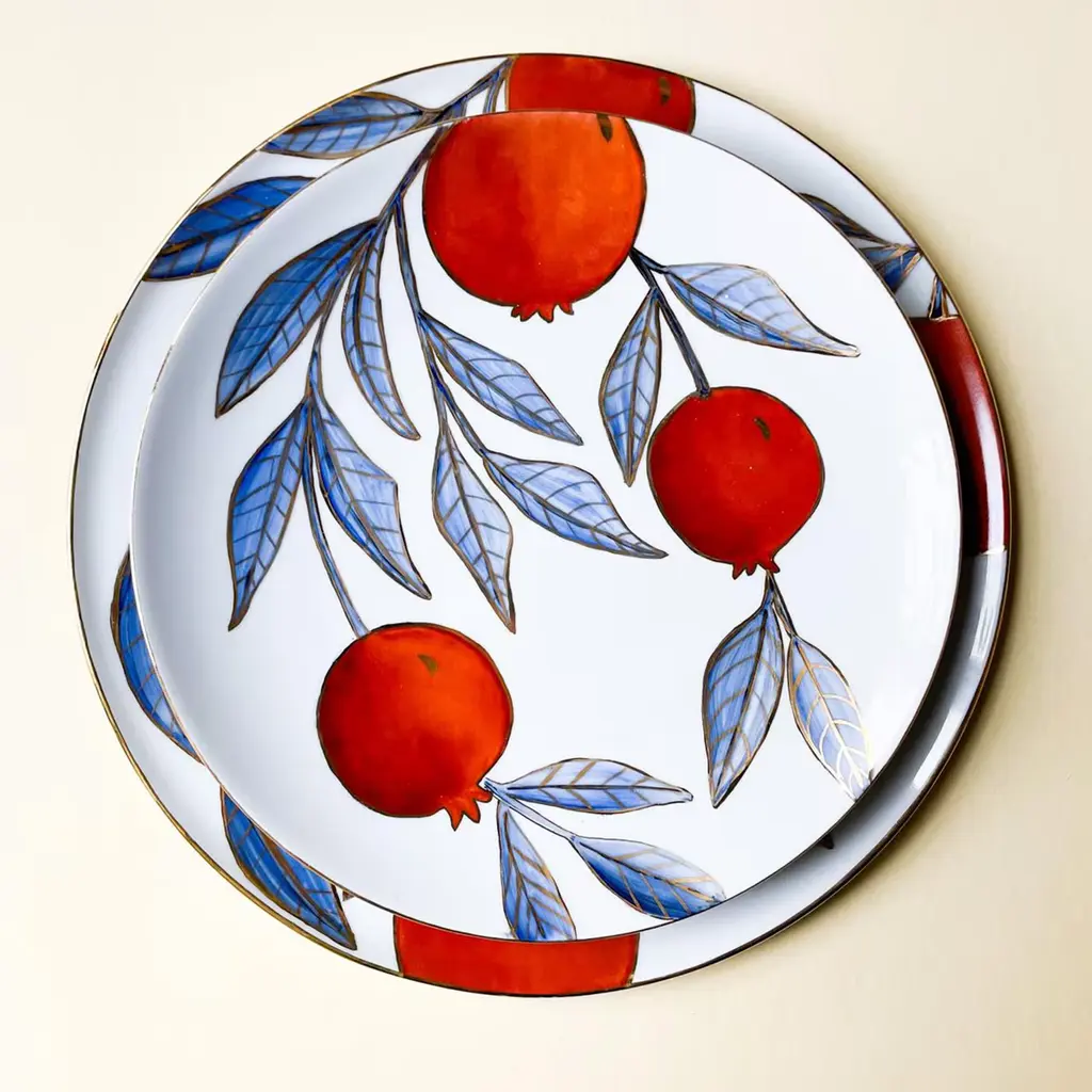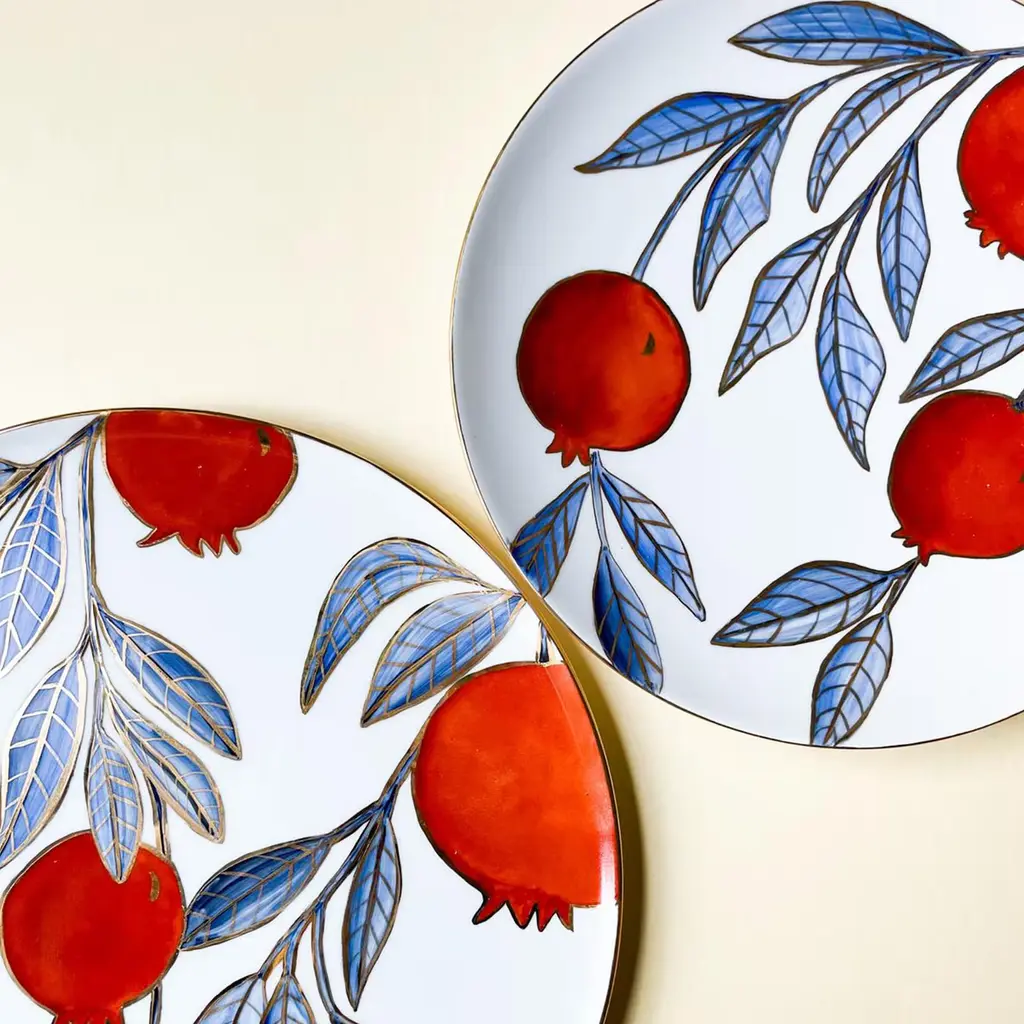 Inspired by the myth of Persephone - who is said to have eaten pomegranate seeds once brought into the underworld by Hades - this fine porcelain plate will enrich tables with its poetic and vibrant personality. Thin glossy golden profiles enrich both the rim and the motif, deftly handpainted in blue and red and sealed through three firing steps. Please handwash or use delicate dishwasher cycles.