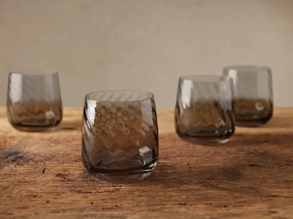The Cora Collection’s smoky grey colored glass features textured detailing to add both visual interest and elegance to any table setting. Set of four wine glasses.