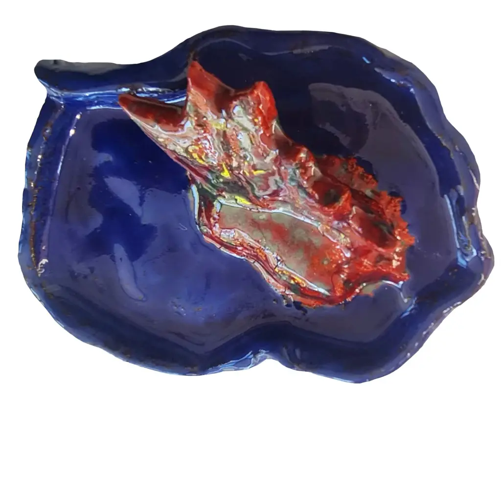 Shiny,degrade coral shape is placed in blue geometric form. This delicate trinket dish is hand made done by ece & serra ceramics x kith&kin lifestyle. This joyful piece adds color to your bedroom