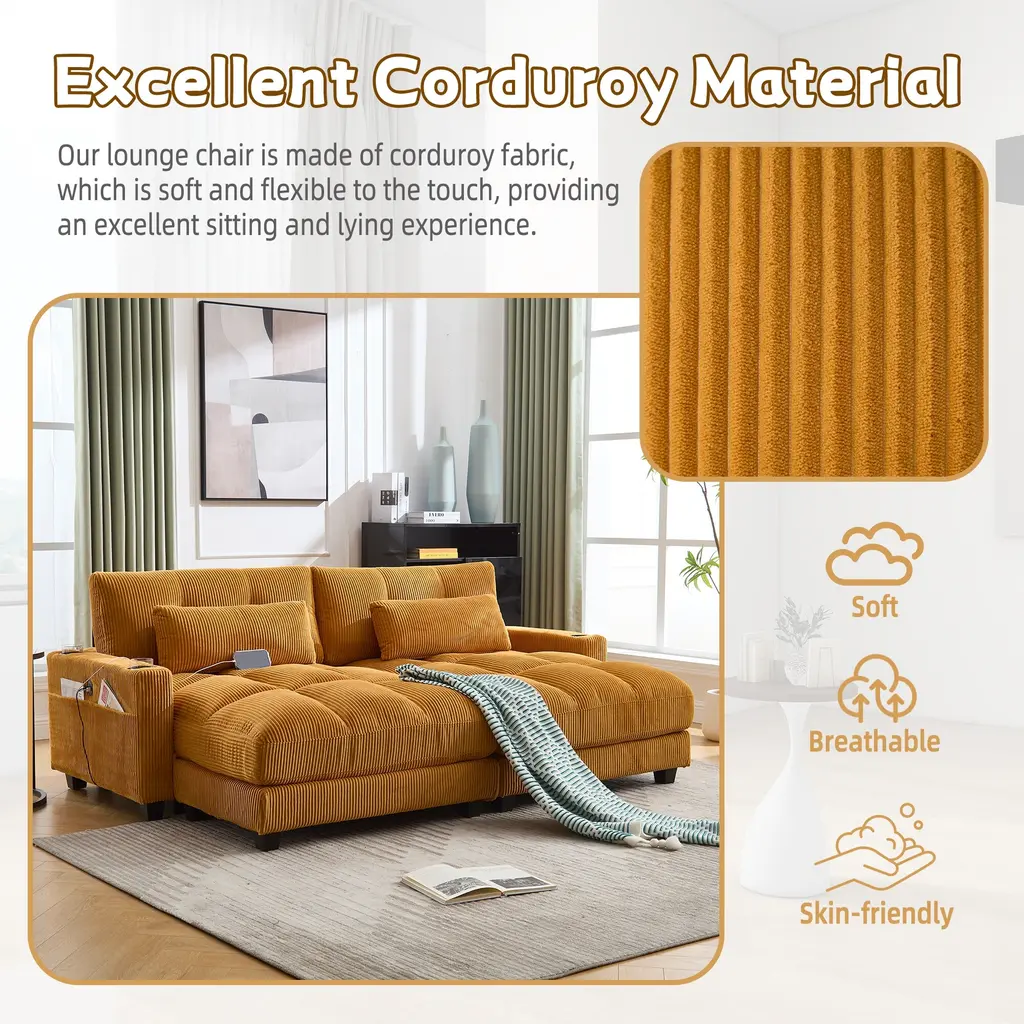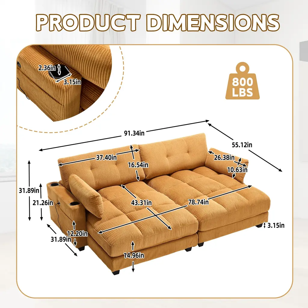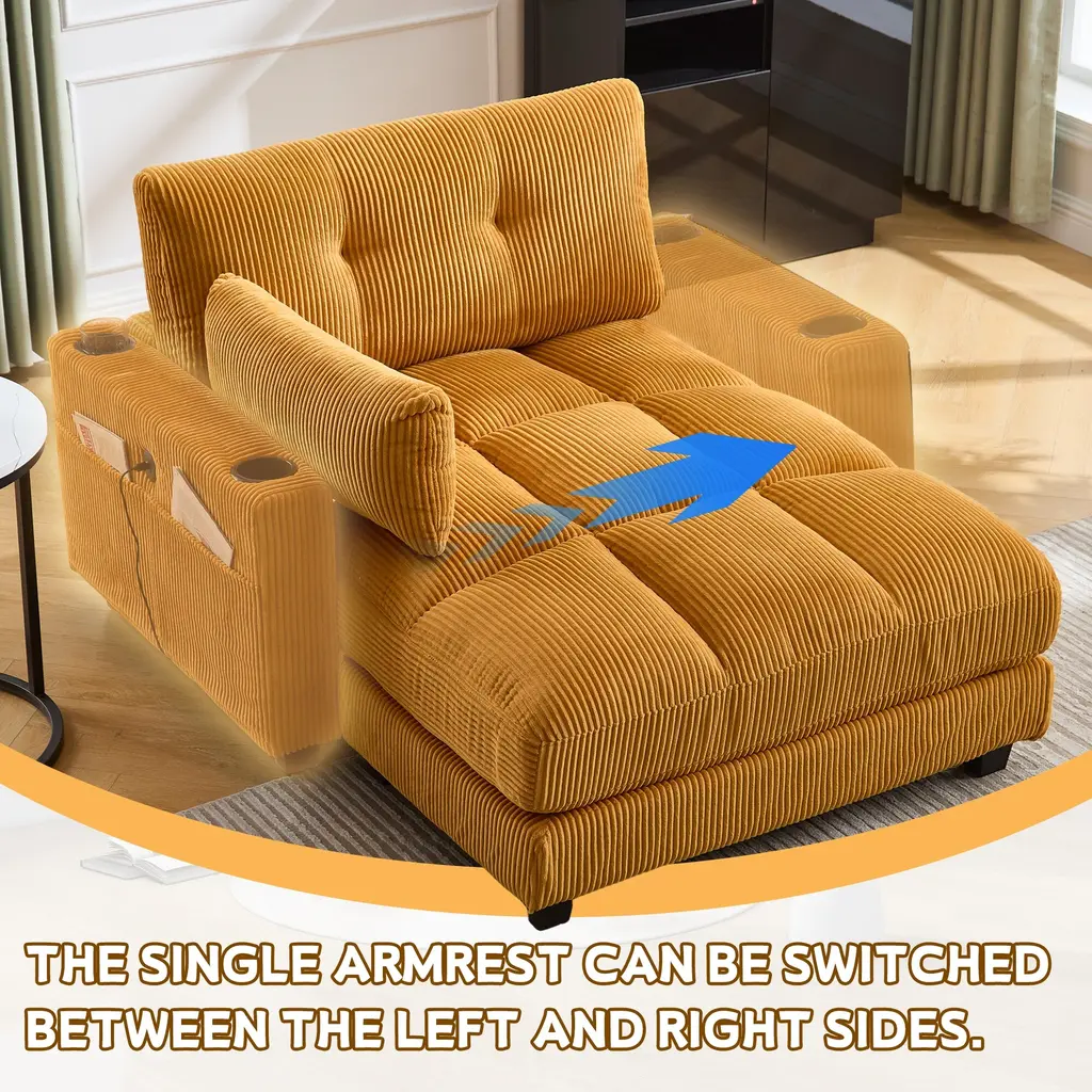 Corduroy Upholstered Oversized Soft Deep Seat Sleeper Loveseats Sofa With Usb,type-C&2 Cup Holders - Mustard Yellow