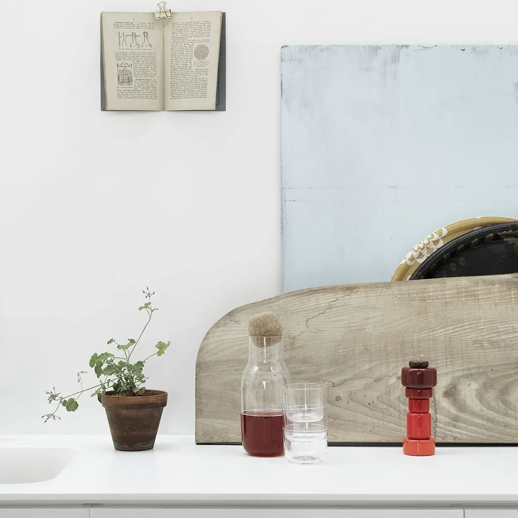 The CORKY CARAFE & GLASSES oversized details play with the conventional bottle shape. The simple yet characteristic design makes it ideal as a water jug or wine carafe and the large opening makes it easy to clean. Corky Glasses are sold separately, here .
