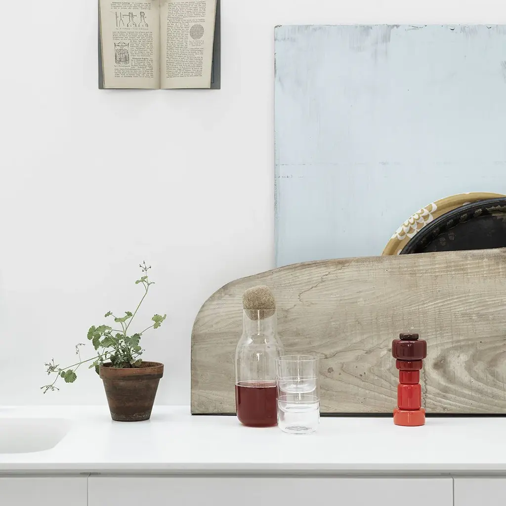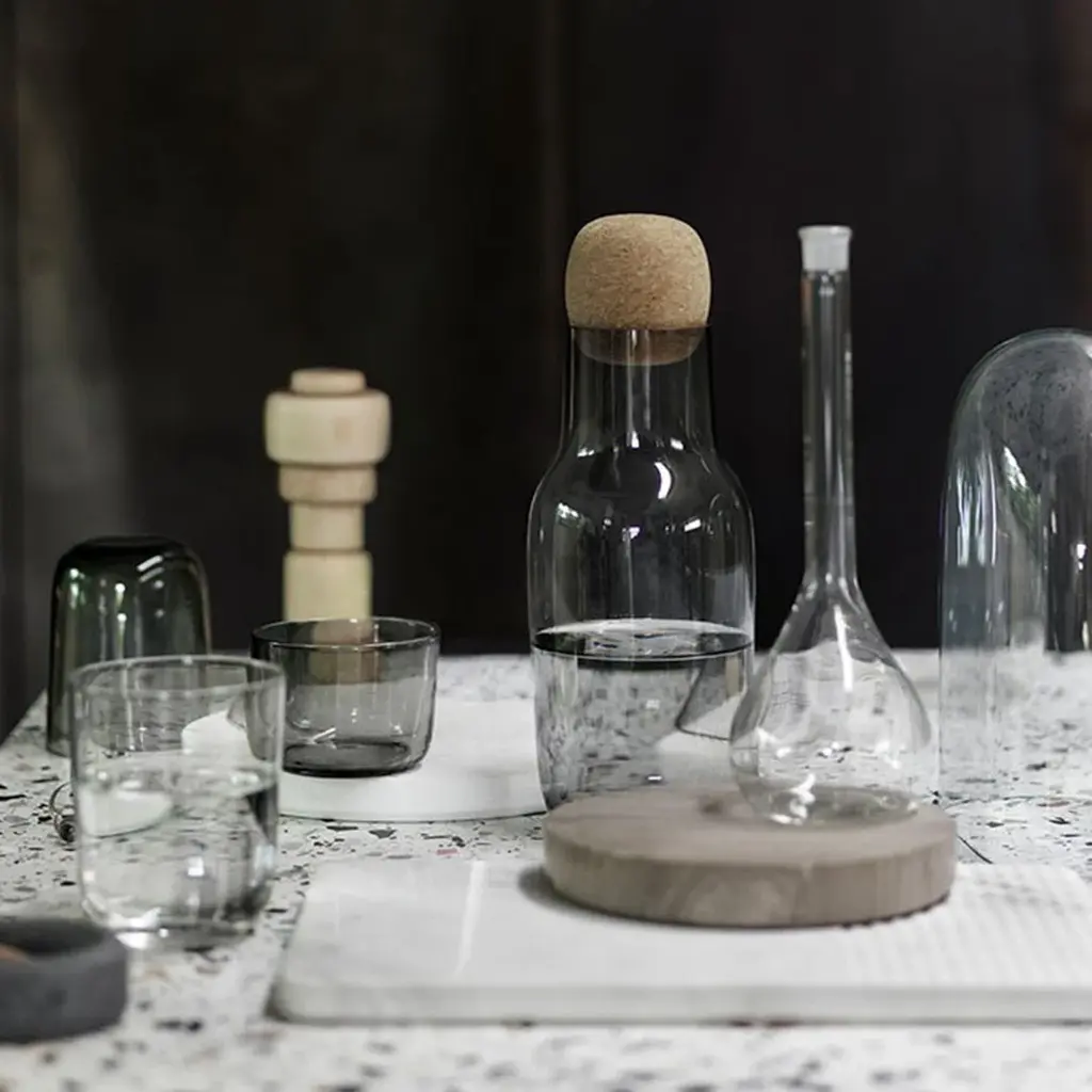 The CORKY CARAFE & GLASSES oversized details play with the conventional bottle shape. The simple yet characteristic design makes it ideal as a water jug or wine carafe and the large opening makes it easy to clean. Glasses are sold in sets of 4. Corky Carafe is sold separately, here .