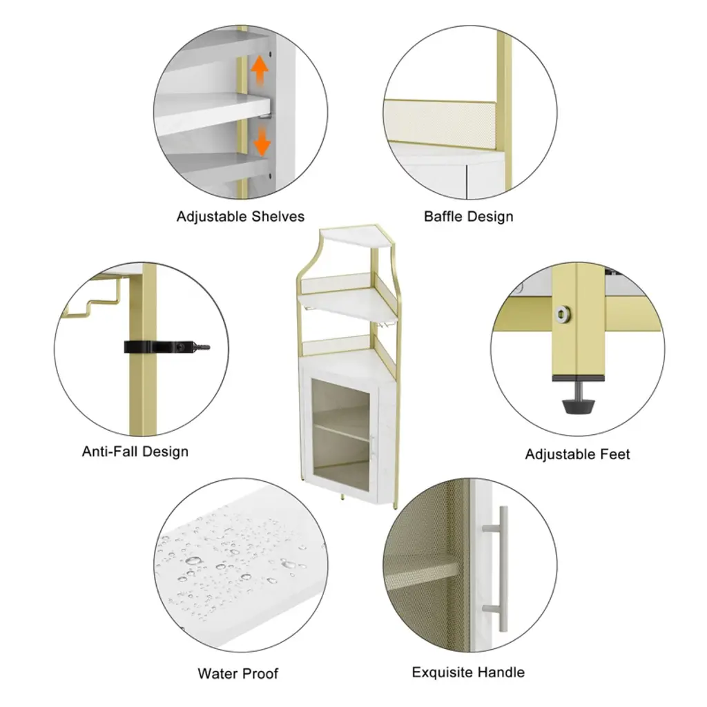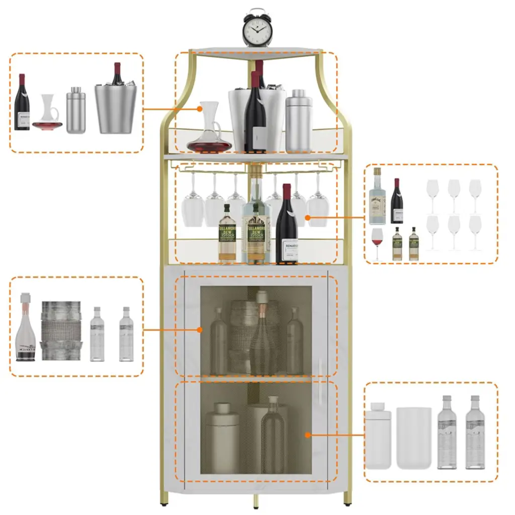 🌺【LARGE CAPACITY WINE CABINET】: The wine rack table cabinet features a well-designed layout with a wine rack, glass holders, storage shelves, and a cabinet. The upper part has a 2-layer open storage countertop, which can store over 50 bottles of wine. The bottom of the corner cabinet is a double-layer storage cabinet with mesh doors, which can hold decanters, ice buckets, wine glasses, etc. 🌺【MAKE USE OF CORNER SPACE】: Elevate your space with the corner design, which allows it to blend seamlessly into any corner of your living room, kitchen, study, or bedroom, ensuring efficient use of your precious space. Additionally, the 29 inches in height wine cabinet is an operation table, which can pour wine, put wine bottles, and wine glasses. 🌺【MULTIFUNCTIONAL DESIGN】: Our wine cabinet functions as a wine rack, glass rack, and storage cabinet. With two layers of storage space that can hold over 50 bottles of wine, offering easy organization and access to your collection. Also, there is a two-layer partition on the top of the operating table, perfect for decanters, ice buckets, wine glasses, and other accessories. 🌺【STURDY AND PREMIUM MATERIAL】: Our bar wine cabinet, made of MDF board, offers excellent bending resistance, waterproof and moisture-proof properties, and exceptional durability. The iron legs provide stability and rust resistance, ensuring a long-lasting product. 🌺【EASY ASSEMBLY】: It can be assembled quickly with our easy follow-up instructions. All the parts are labeled clearly. Which can save you time and energy. Besides, our customer team aims to respond to all inquiries within 24 hours.