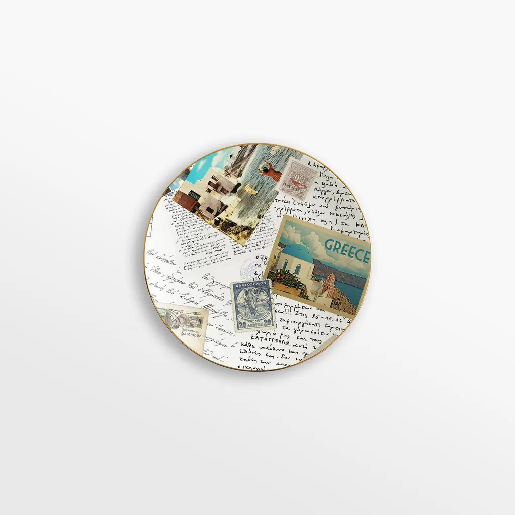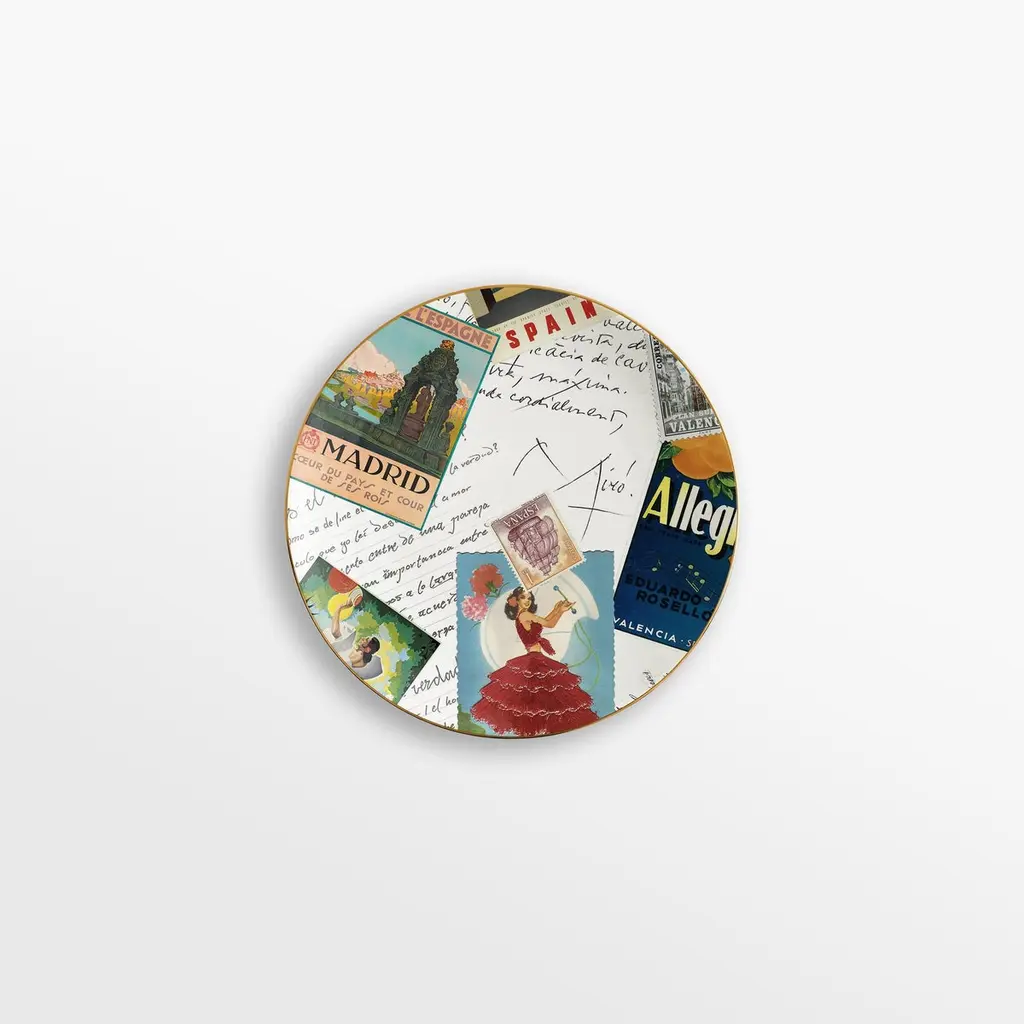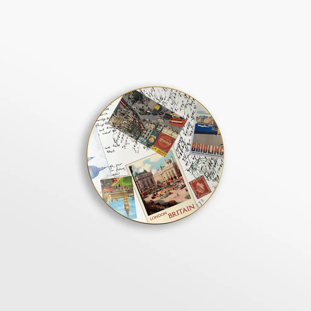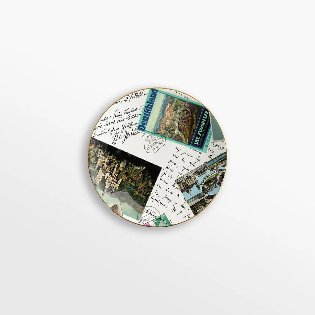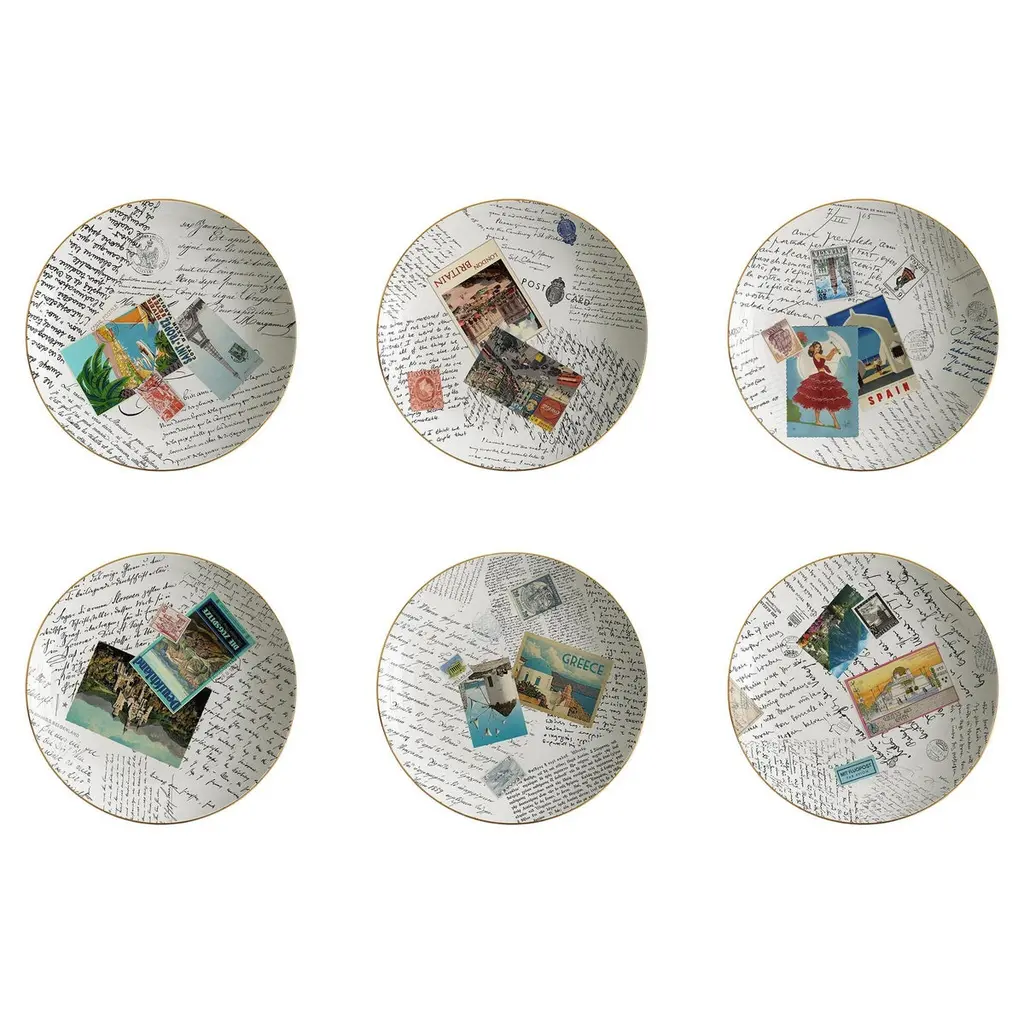 Vito Nesta Grand Tour's "Corrispondenze" collection is a portrait of what we carry with us after every journey we make in the world. Images, colors, sounds, views and suggestions. All this is transformed into a visual language in this collection of dishes that portray a multitude of postcards, letters, stamps and posters as if they were poured onto a table. Each dish tells a European state, these six states are France, England, Germany, Greece, Austria and Spain.Measure: Set of six 16cm diameter bread plates.