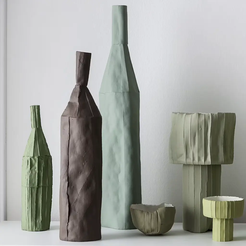 Part of the Cartocci Collection, this stylish sculpture of paper clay reinterprets an everyday object with contemporary flair. Adding natural fibers to a clay base, ceramist Paola Paronetto creates a series of decorative objects with an intriguing texture. This stylized bottle features a cylindrical body with a long neck in a hunter green color and vertical ridges that add lightness and a dynamic character. This piece has a modern design that is perfect for decorating any corner of the home. Every one of Paola Paronetto’s creations is unique. Slight variations in shape, colour and size are to be considered a guarantee of authenticity and value. They are finished with non-toxic satin-finish enamels. Although very rarely, it is possible for them to leak after long periods of exposure to water. It is therefore advisable to test their water resistance before using them on delicate surfaces. They should not be used as dining utensils. The white pieces can be washed with water or sanitizing products, whereas the coloured pieces must be treated more gently and cleaned with a feather duster or a soft cloth, dry or moistened very slightly with water.