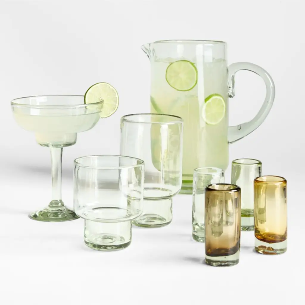 Skilled artisans craft Cortez from discarded glass, melting and blowing it into casual drinkware inspired by oceanside dining. Exhibiting the pleasing green tint characteristic of recycled glass, the classic pitcher gets an update with a footed design, petite pouring spout and oversized handle. We love the laid-back look and satisfying heft that feels great in hand. Fill the glass pitcher with batch cocktails, iced tea or water, and pour summery sips into the coordinating Cortez margarita, double old-fashioned, highball and shot glasses.