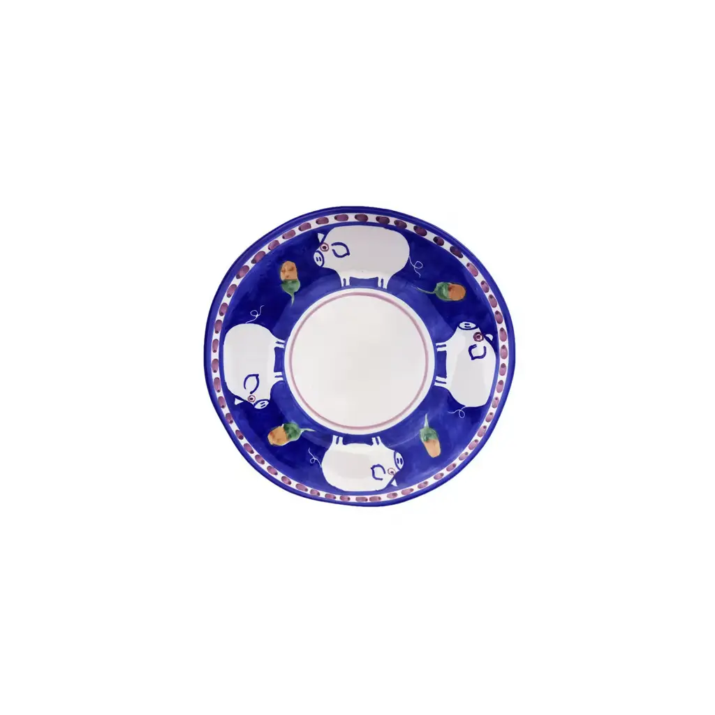This polished, hand-painted ceramic set including six dinner plates (⌀ 29 cm), six soup plates (⌀ 23 cm), and six fruit plates (⌀ 23 cm) boasts a colorful design that strikes with its bucolic charm - hence the collection's name ("cortili" means "courtyard" in English). Externally left white, the inside of each piece showcases wide rims whose blue shade outlines the profile of pigs, which alternate with flower buds painted green and ocher.