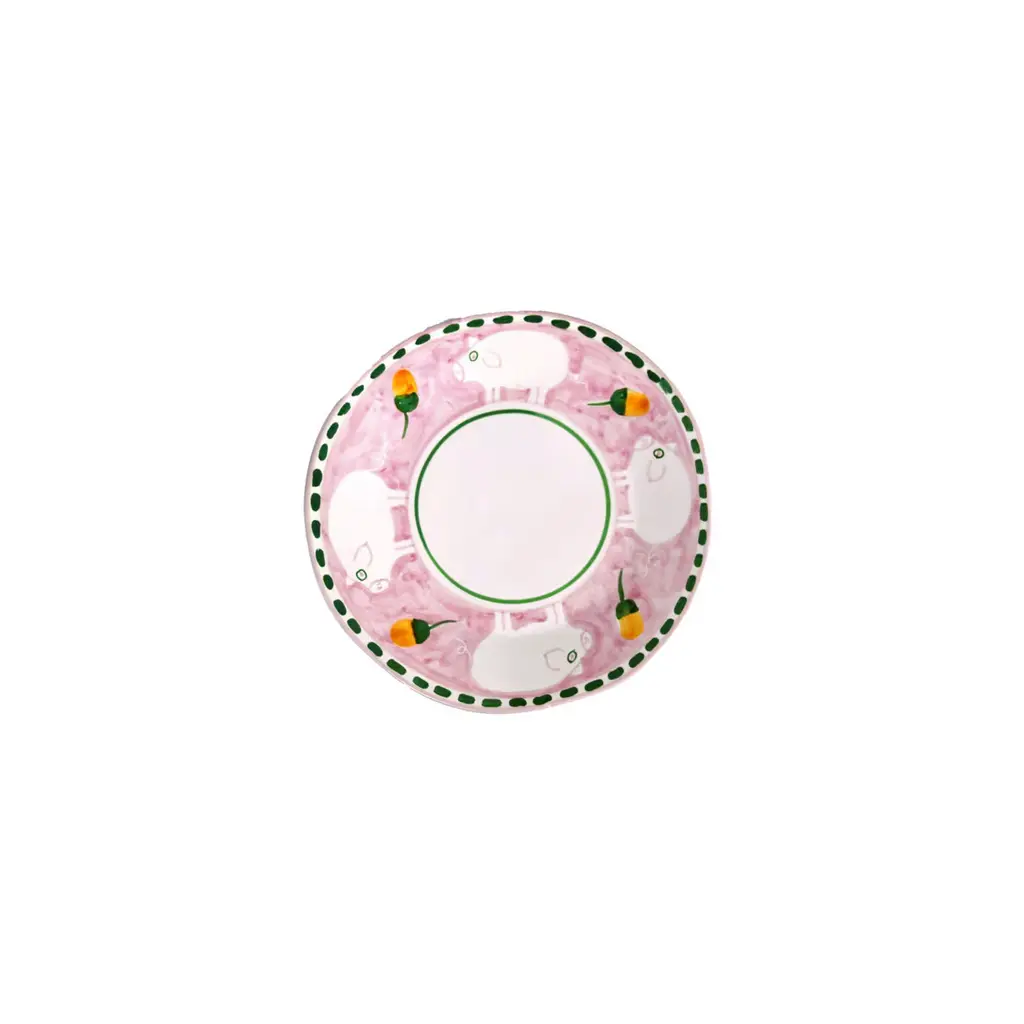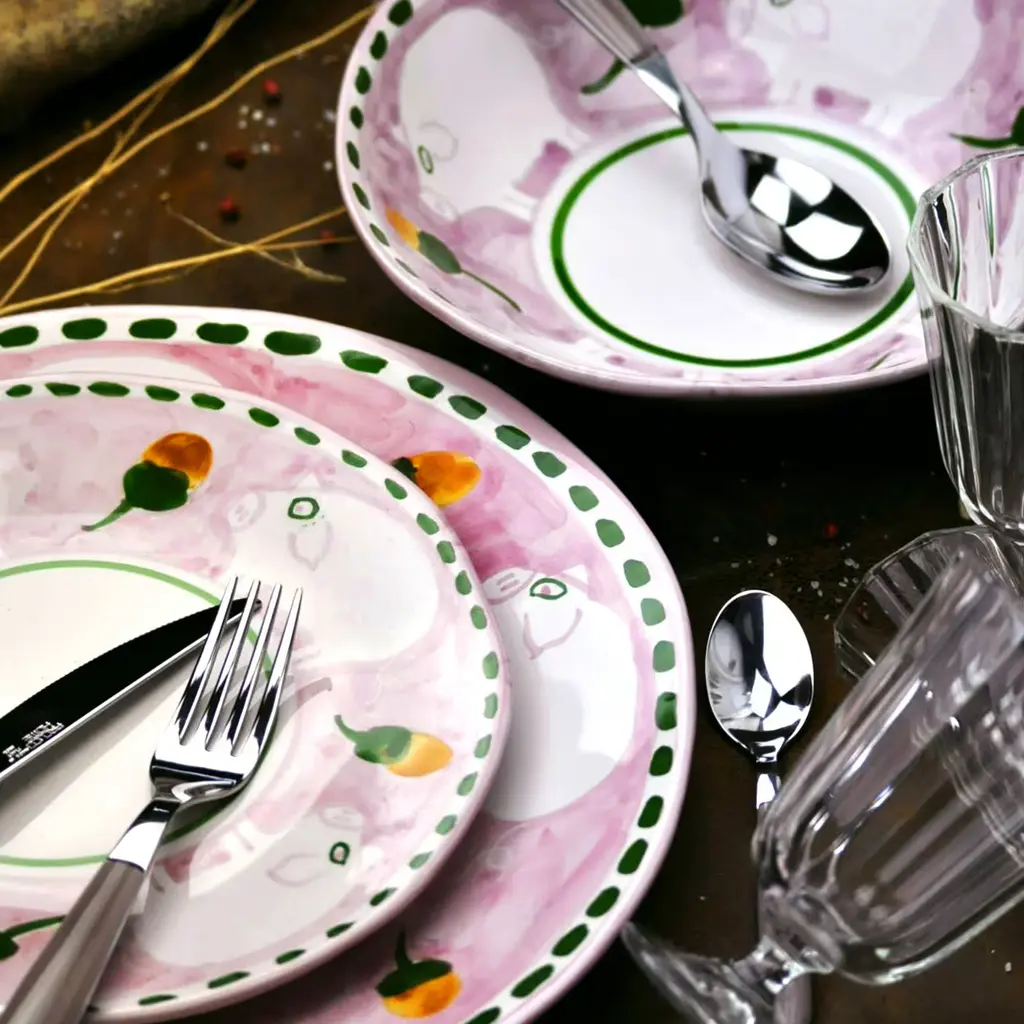 Fashioned of the finest ceramic and consequently painted by hand, this fascinating set inspired by pastoral atmospheres comprises six dinner plates (⌀ 29 cm), six soup plates (⌀ 23 cm), and six fruit plates (⌀ 23 cm). Each piece showcases white pigs on a pink background from which emerge the flower buds rendered in deeper ocher and green tones. The dashed green motif gracing the plates' upper rim matches with the inner circular line defining their central section.