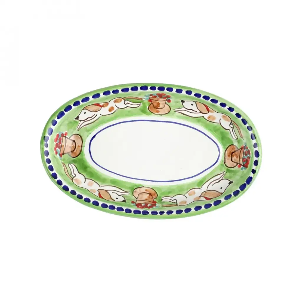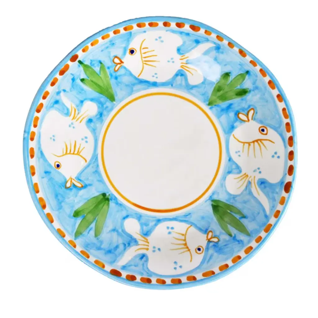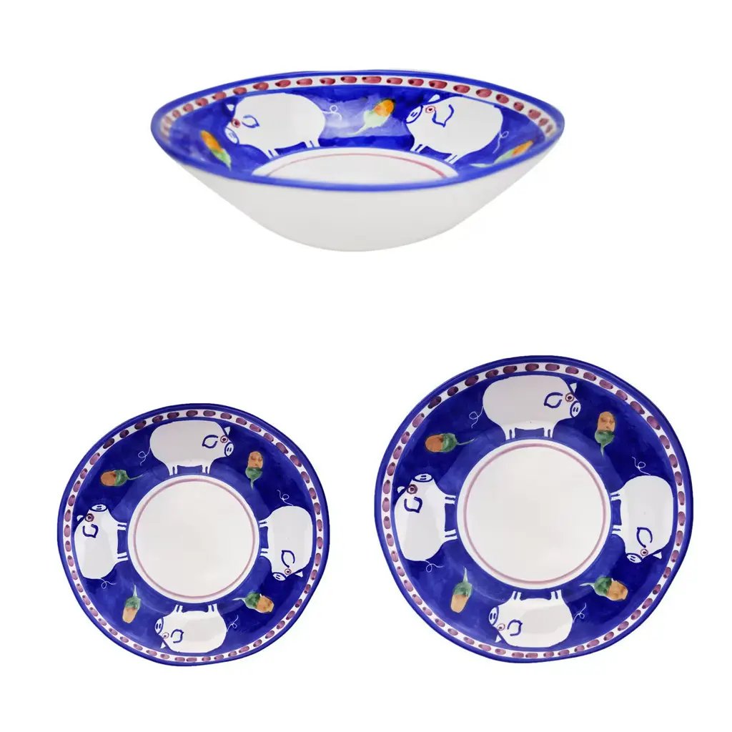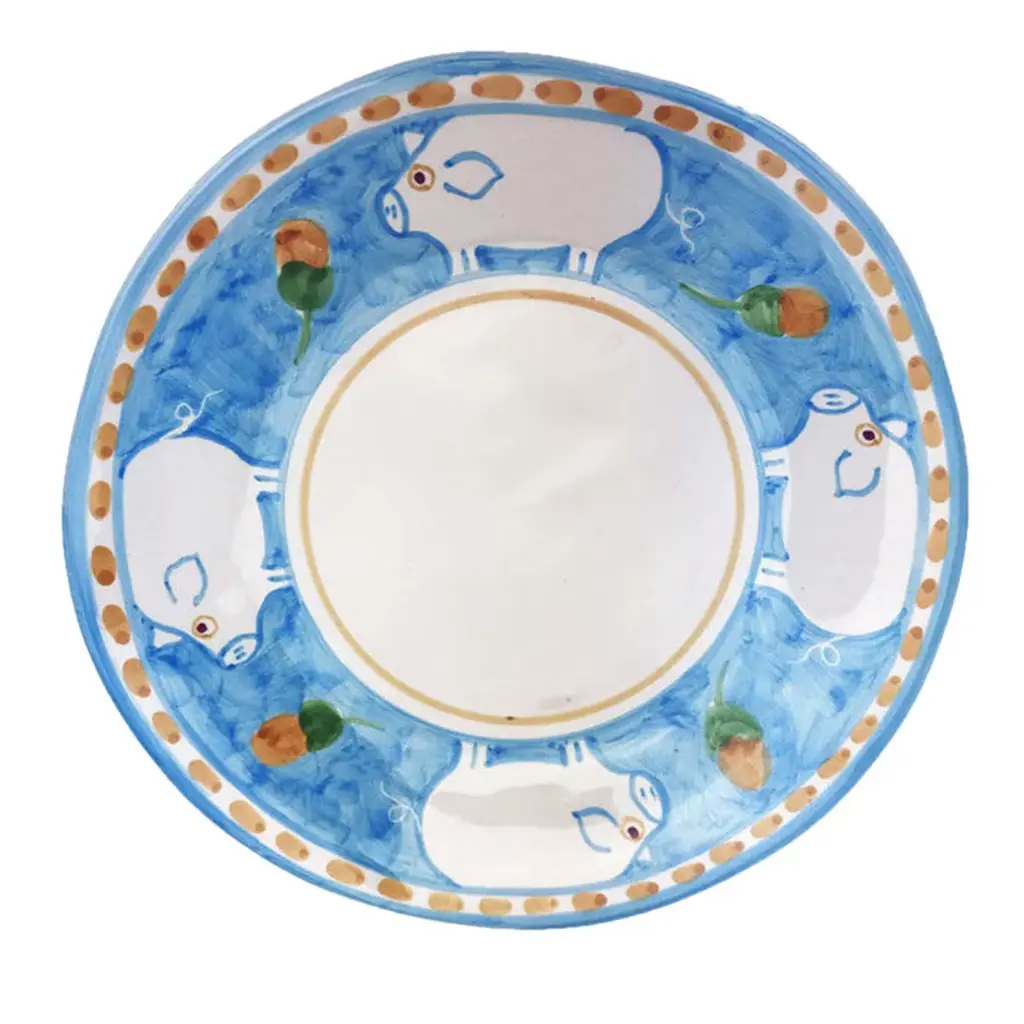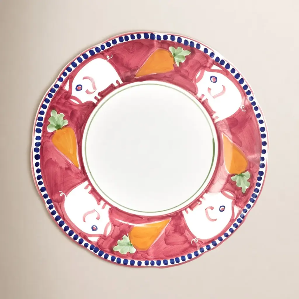 This captivating ceramic set including six round charger plates will add an intense dash of color to any sober table setting. Minutely painted by hand, the plates' interior flaunts a sequence of white pigs and two-tone ocher and green flower buds gracing the wide border while perfectly expressing the collection's aesthetic - hence the name Cortile, the Italian for courtyard.