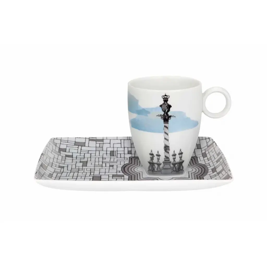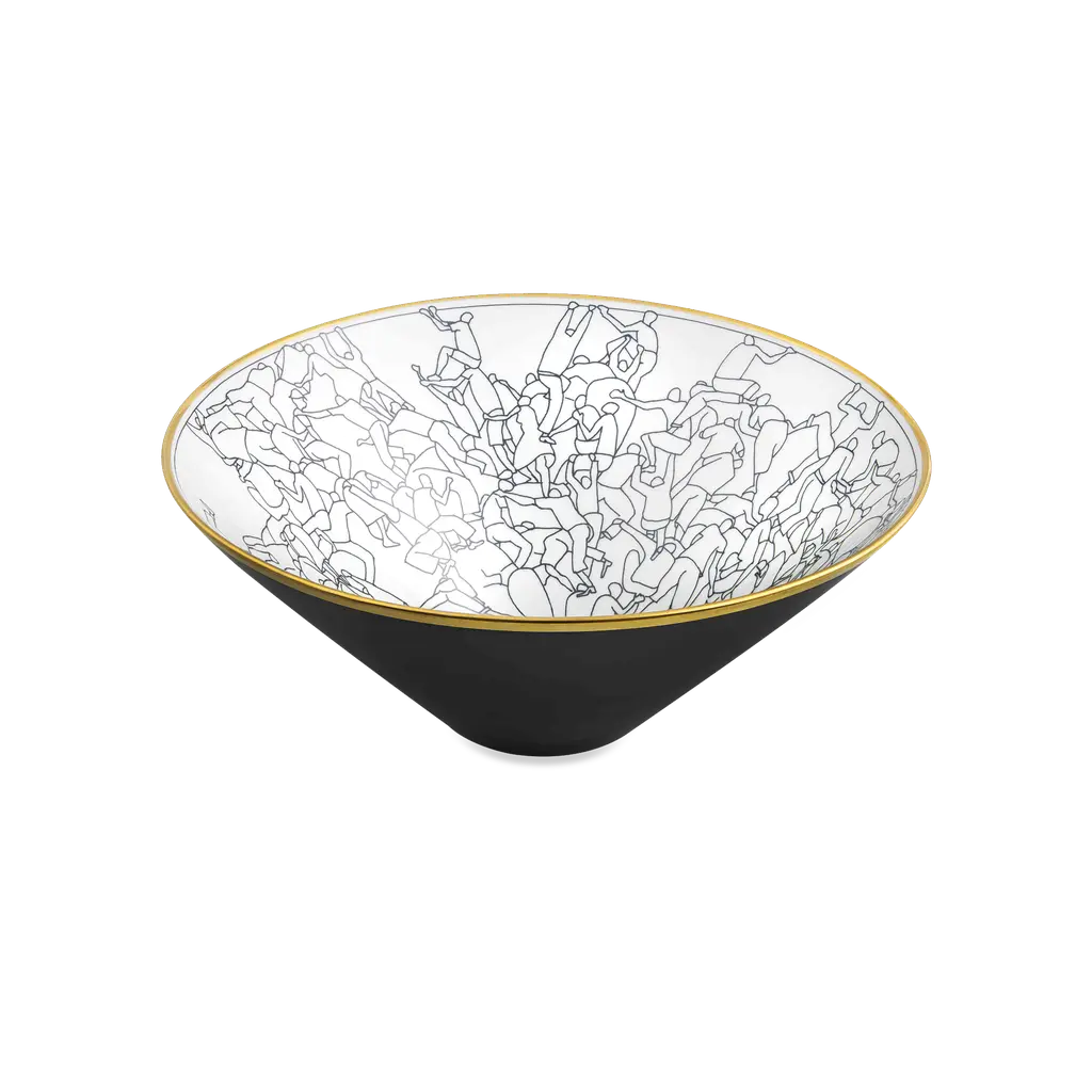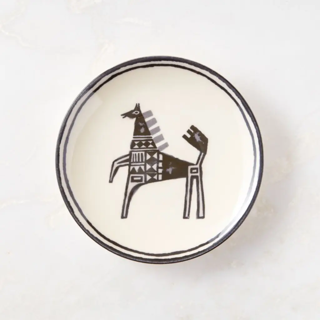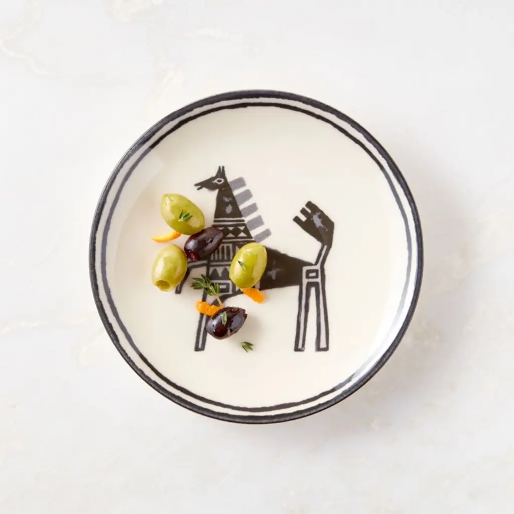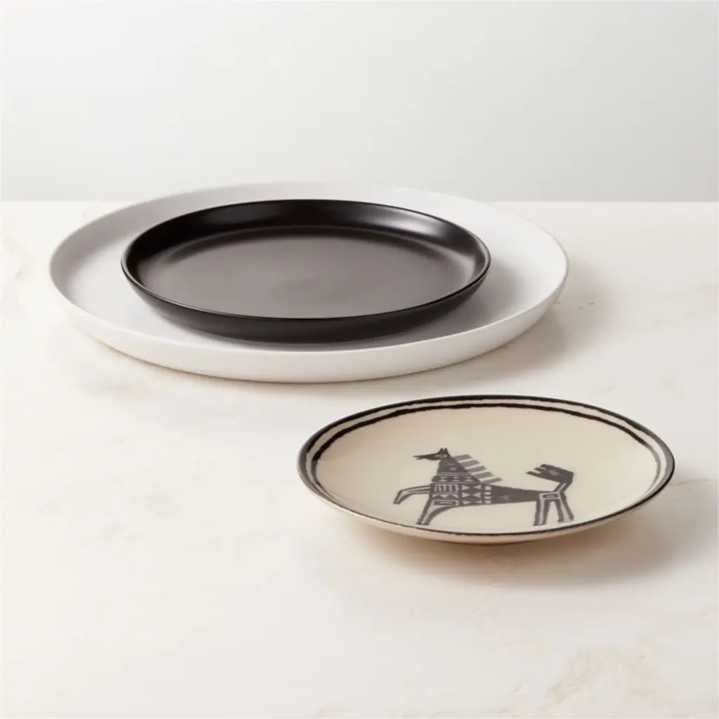 Designed by famed midcentury artist Evelyn Ackerman, elegant appetizer plates pay homage to the natural expressions of California midcentury modernism. Reproduced from an original woven tapestry by Ackerman, the distinctive stallion motif is applied by skilled artisans in Portugal with a reactive glaze to create subtle variations unique to each piece. CB2 exclusive.Detroit natives Evelyn and Jerome Ackerman founded ERA Industries in 1956. For 50 years, the Los Angeles-based couple played a central role in shaping the California midcentury modern movement. In 1957, Evelyn began designing handwoven tapestries that could translate into ceramics. Presented in collaboration with Ackerman Modern, the pieces in this collection recreate the couple's iconic midcentury designs using original drawings and archival photographs.