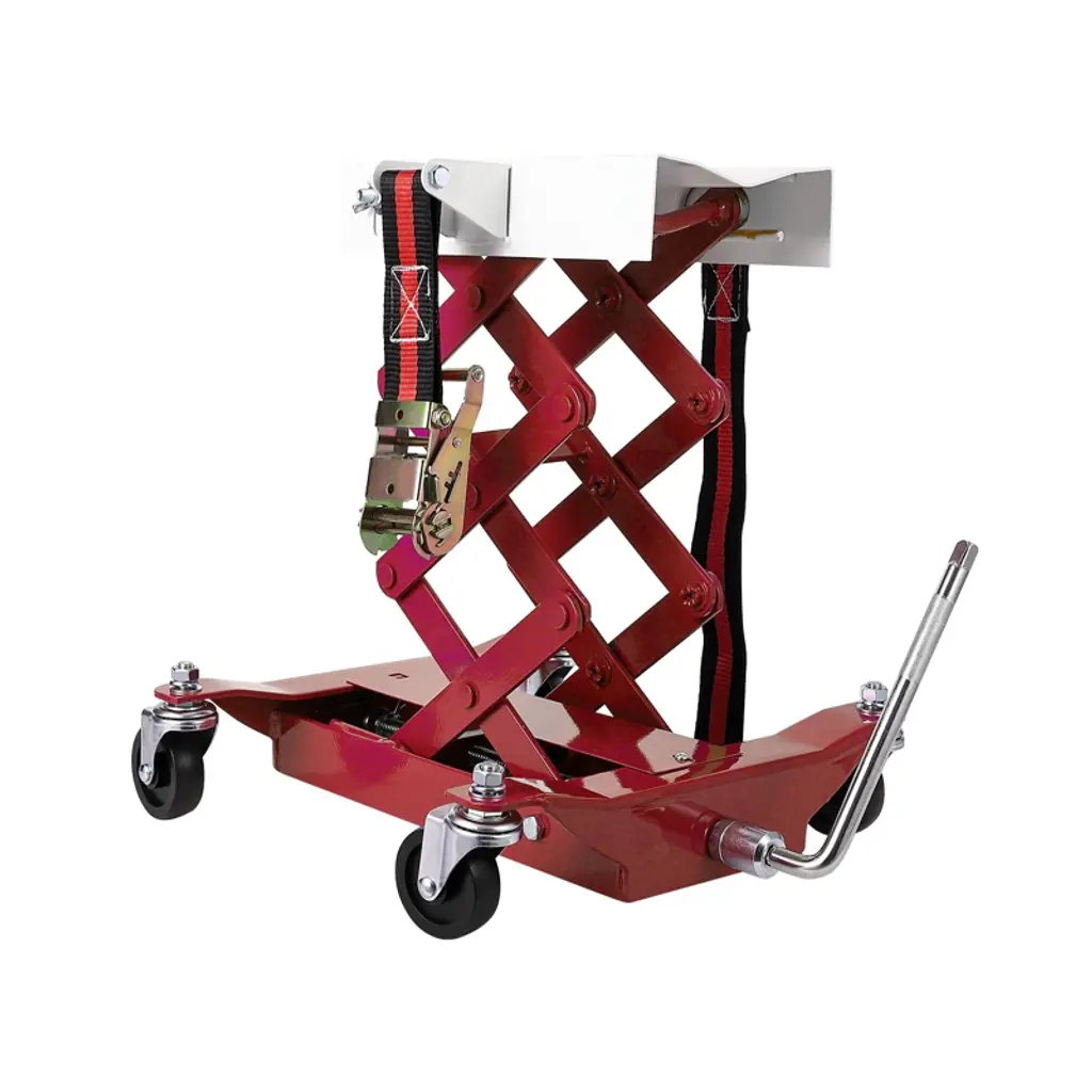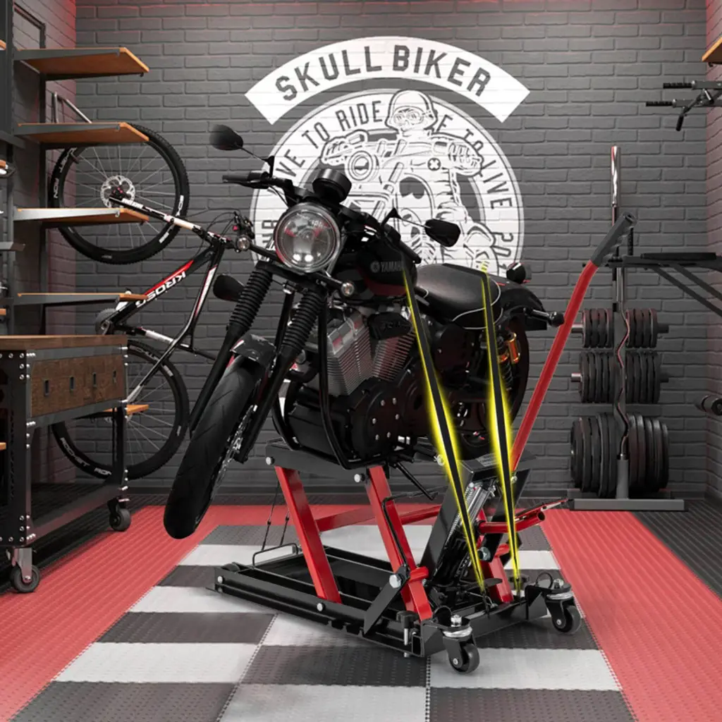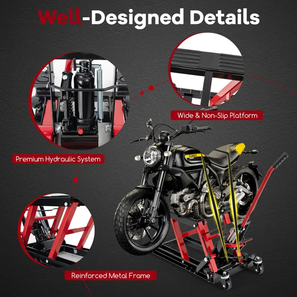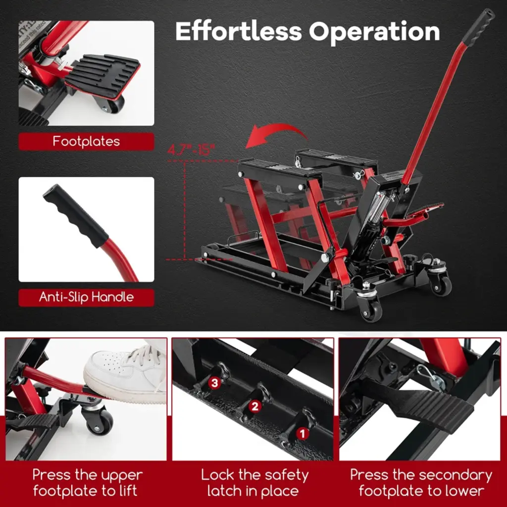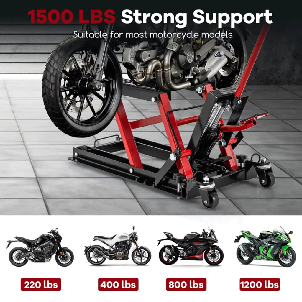 Achieve effortless vehicle maintenance with this heavy-duty motorcycle lift, which can support up to 1500 lbs with reliability and ease. This motorcycle lift features a robust hydraulic system that allows smooth lifting from 4.7 to 15 inches, and a simple foot operated mechanism for straightforward raising and lowering. It also comes with 2 ratchet belts for secure fixation. The strong construction and adjustable feature make it suitable for most motorcycle models. And the wheeled base makes it easy to slide under the motorcycle. Perfect for professionals and hobbyists alike, this motorcycle lift simplifies repairs and maintenance, providing a secure and adjustable platform for motorbikes, ATVs, and dirt bikes.FeaturesSupports up to 1500 lbs with sturdy metal construction Anti-slip platform for higher safety Features hydraulic system for effortless lifting Includes 2 ratchet belts for secure fixation Adjustable height ranges from 4.7 to 15 inches Equipped with 4 wheels and long handle for easy movement Offers a simple foot-operated lifting mechanism Available for most motorcycles, ATVs and dirt bikesColor: Black and Red Material: Metal, Rubber Overall Dimension: 42'' x 14'' x 29''-36''(L x W x H) Dimension of Platform: 11'' x 2.5'' x 4.7''-15''(L x W x H) Weight Capacity: 1500 lbs Net Weight: 62 lbs Package Includes: 1 x Motorcycle Lift Jack 2 x Ratchet Belts 1 x Instruction
