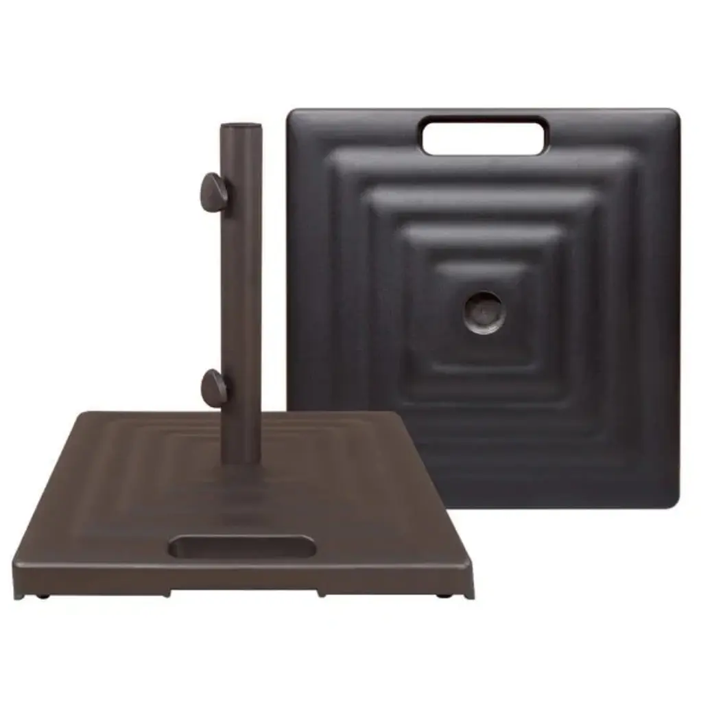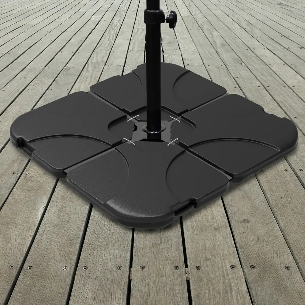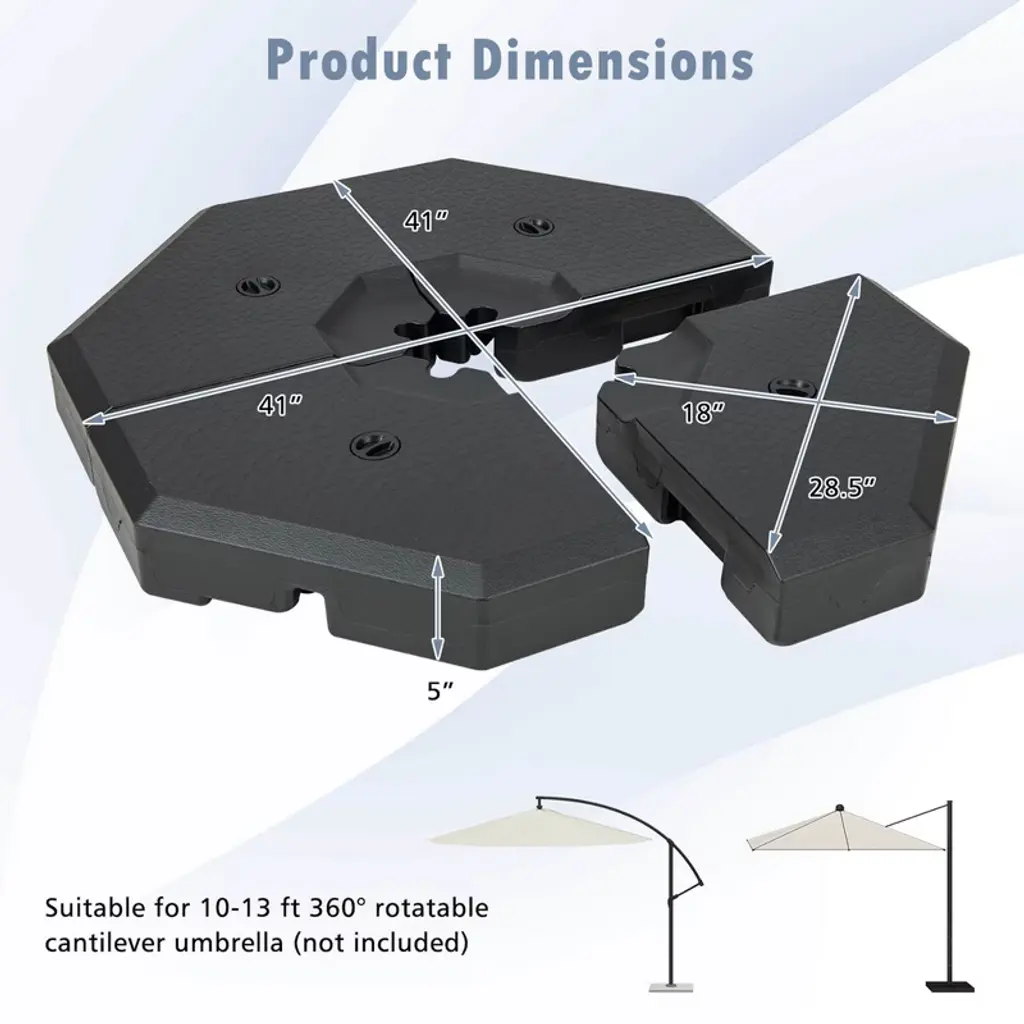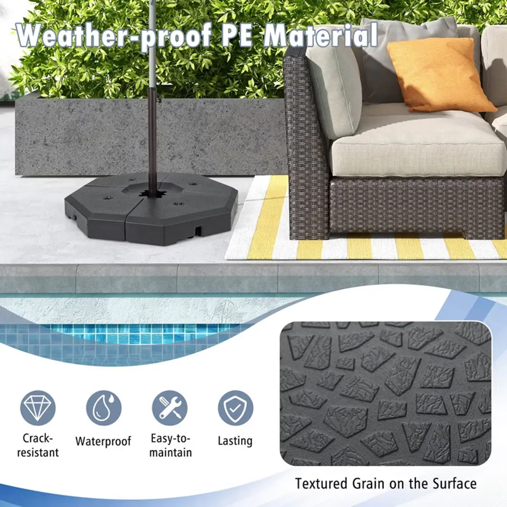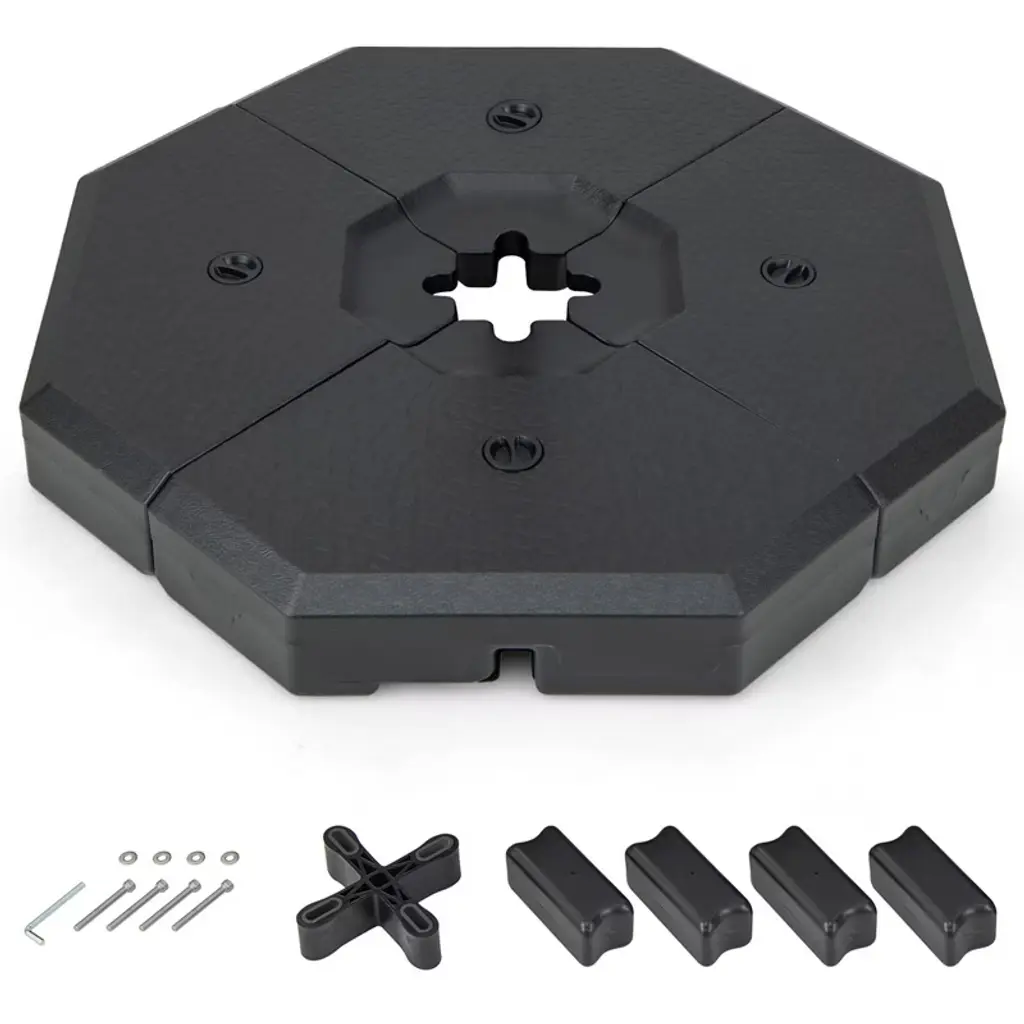Are you still looking for a sturdy and sturdy base weight to support your umbrella? This is our powerful base weight that can be perfectly fixed even in windy conditions. The combination of sturdy PE material and excellent blow molding technology, it can ensure weather resistance and long lasting use. Four plates are connected by four connectors and heightening pad and the sturdy 4-plate structure is very easy to disassemble and carry. Most importantly, you can fill it with water so that it can weigh up to 220 pounds, ensuring the stability of the umbrella. Also, the easy-to-fill filling ports can help you fill quickly without wasting time. The concave handle on each plate are also easy to move and store. And unique octagon appearance adds elegance to your outdoor space, perfect for patio, garden, courtyard, porch and poolside. FeaturesRapid filling conveniently: the large diameter water injection ports. Can be put in garden, courtyard, porch and poolside. Easy to movement and storage. Easy to maintain: the black surface is stain resistant. Long lasting use: made of high quality PE material, ensuring weather-resistant. Strong 4-plate construction ensures stable support. Easy to assembleColor: Black Material: PE Overall Dimensions: 41''X41''X5.5''(LXWXH) Each Plate Dimensions: 28.5''X18''X5.5''(LXWXH) Net Weight: 22 lbs The Weight of Filled with Water: 220 lbs Package includes: 1X Base Weight 1X Instruction