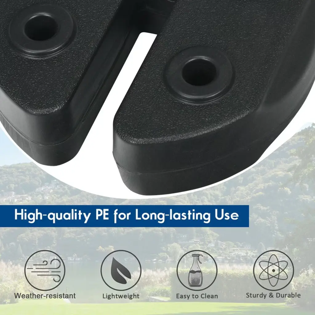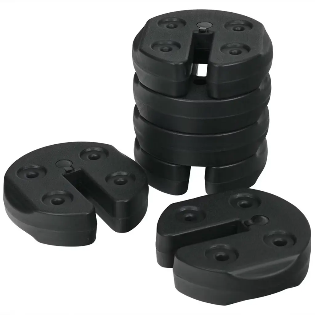 Are you still bothered that your tents, canopies and patio umbrellas are often blown over on windy days? Our 4-piece weight plate set will be the ideal solution! Made of high-quality PE, our weight plates are durable and resistant to aging or cracking. The no-pinch design enables easy and safe installation without hurting fingers. The 1 1/4'' wide open slot is suitable for most canopy legs. It is worth mentioning that each weight plate has an injection spout that allows you to fill in water or sand to increase weight to better hold down the canopy. If necessary, you can also choose to stack weight plates together. Compared with sandbags, our canopy weights are more beautiful and portable, suitable for outdoor events such as picnics, parties, trade shows, etc.FeaturesColor: Black Material: PE Product Dimensions: 9.5'' x 9.5'' x 2.75'' (L x W x H) Net Weight: 3/4.5/6 lbs / set Weight of Filled with Water: 5 lbs per plate Pole Size Requirements: up to 1.25'' wide Package includes: 4/6/8 x Weight Plate 1/2/2 x Strap